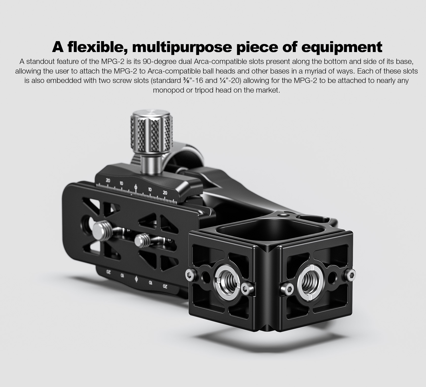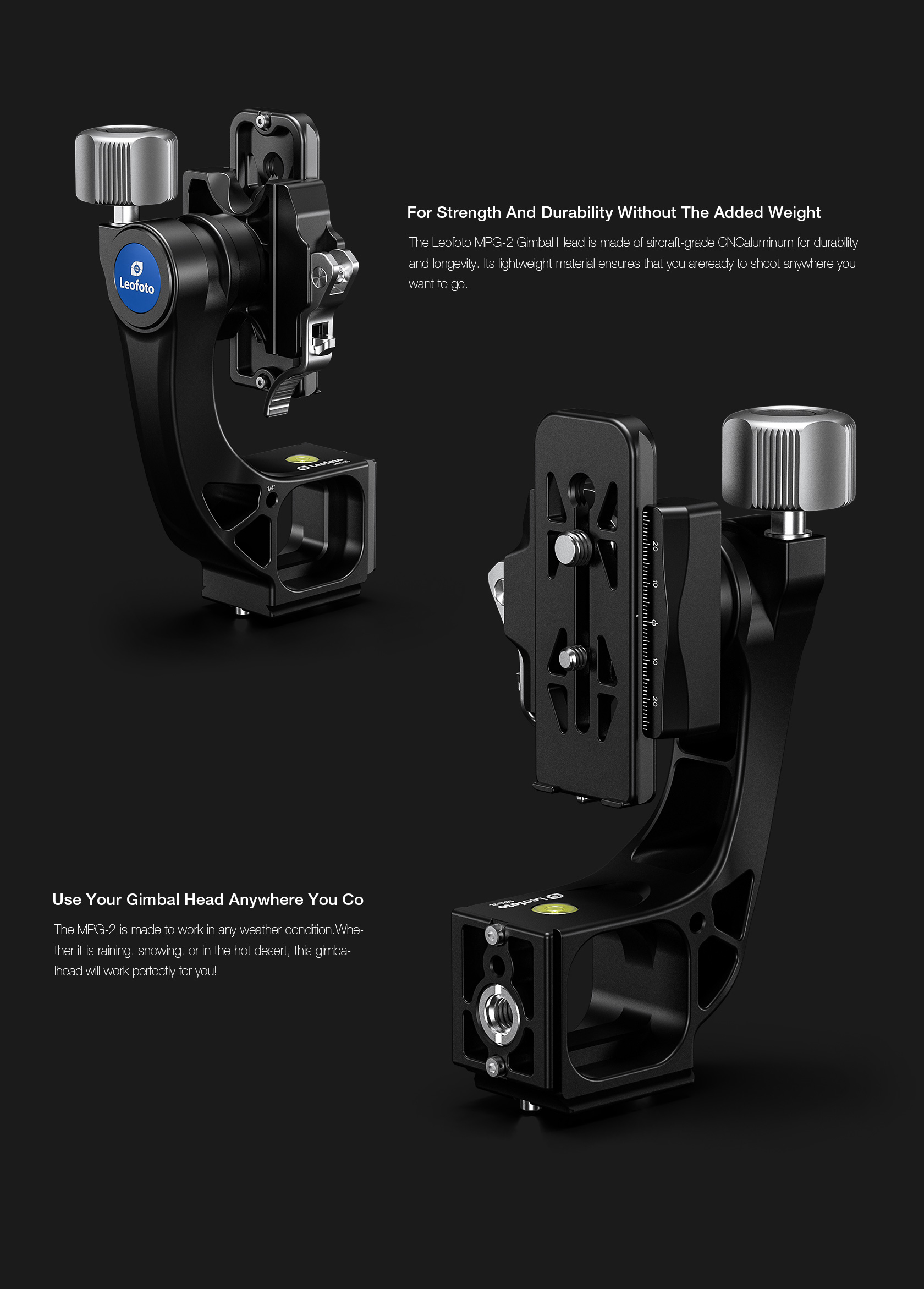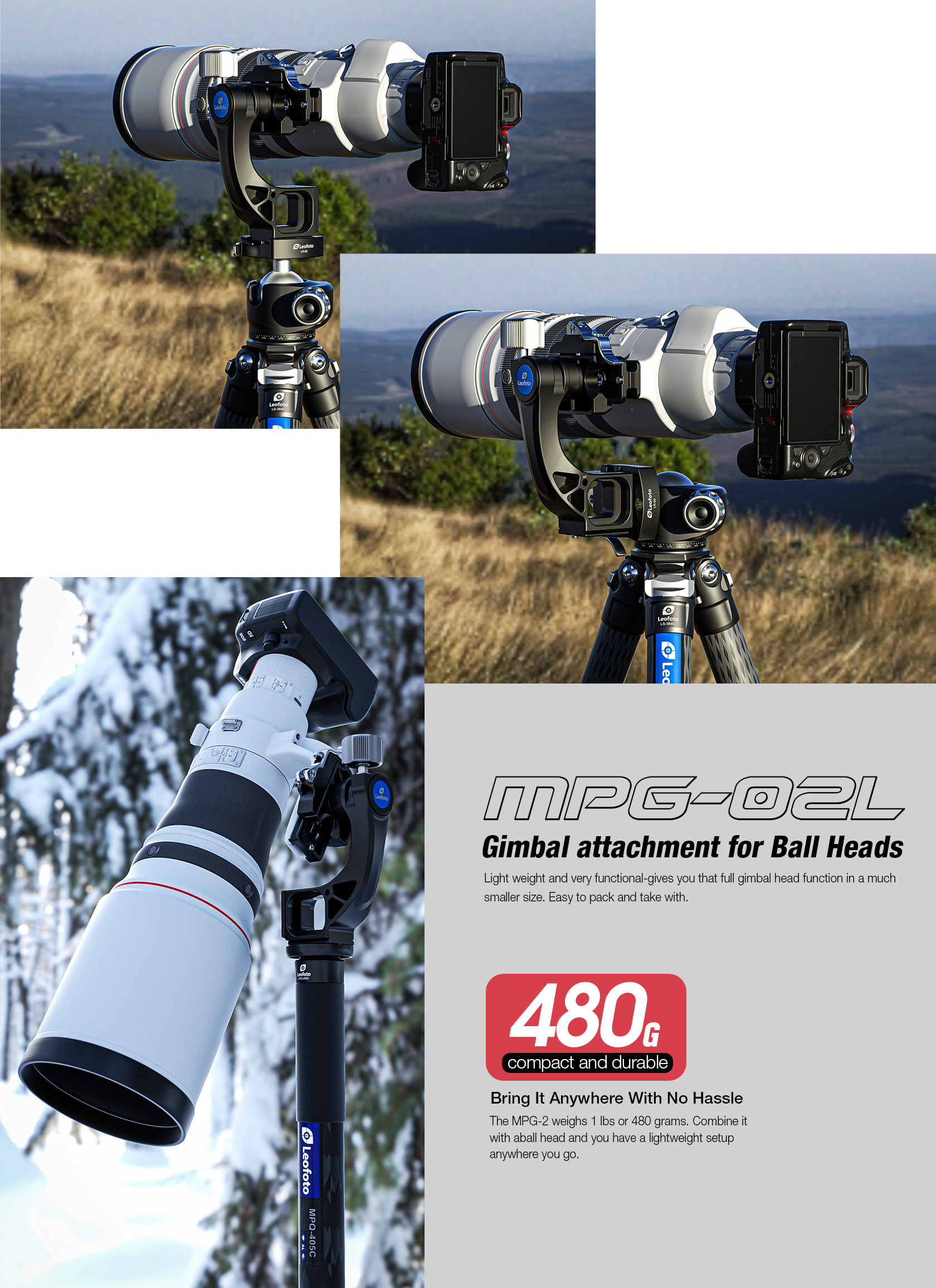 The Leofoto MPG-02/L Gimbal Attachment converts a standard ball head into a gimbal-style setup, crafted from CNC-machined aluminum for durability and precision. It features two Arca-type dovetail bases, a 3/8”-16 threaded mounting socket for broad tripod and monopod compatibility, and a redesigned Arca plate optimized for long lenses, supporting both 1/4” and 3/8” screws.