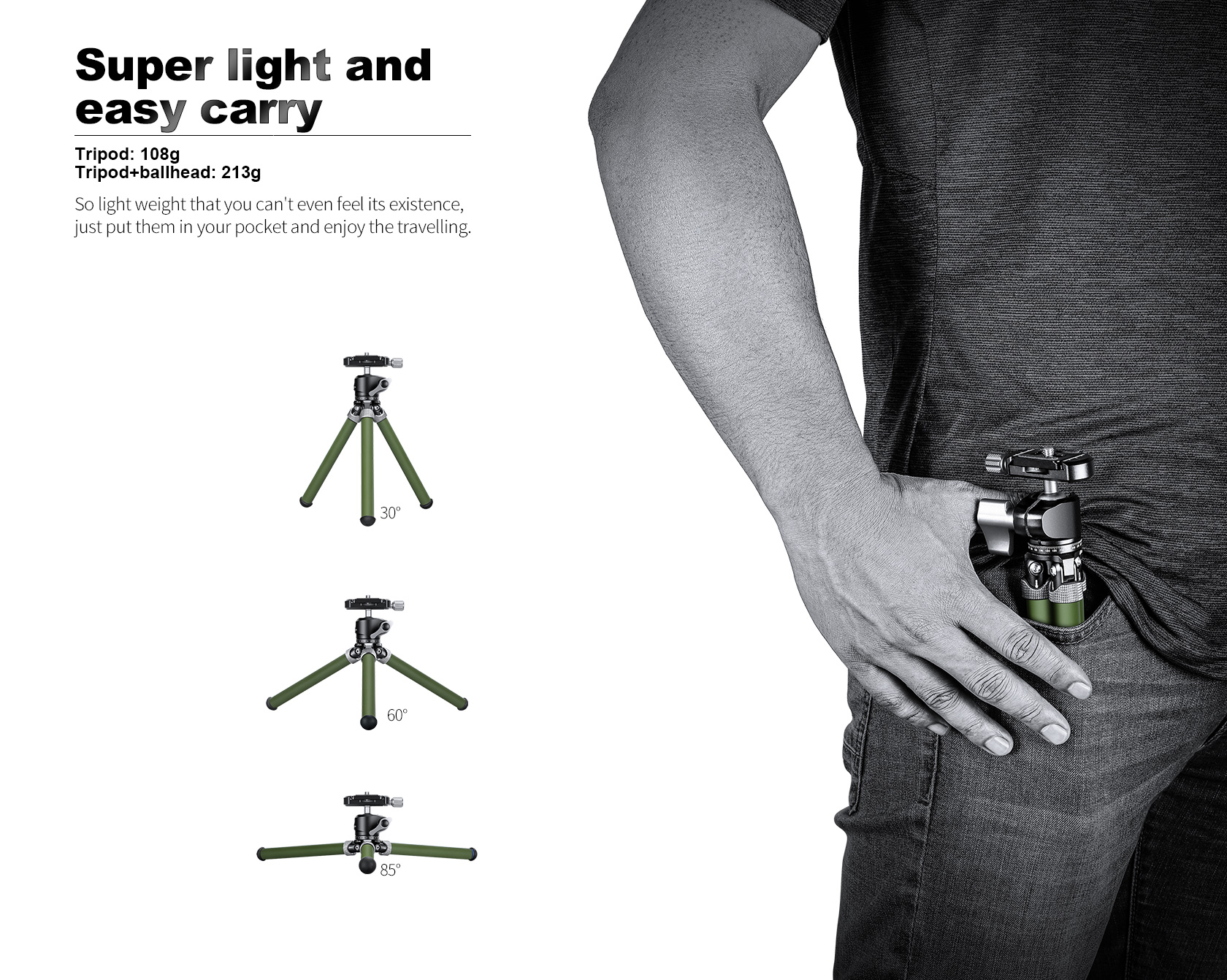 The Leofoto MT-02C Mini Tripod adjusts into different positions without any knobs or levers having to be used. The featured two-finger, knurled leg locks are extremely convenient for setting each leg to the desired angle individually. The legs allow you to have 3 variable leg angles, 30-degree, 60-degree, and 85-degree. The compact single leg section tabletop tripod features a 1/4″-20 mounting screw.