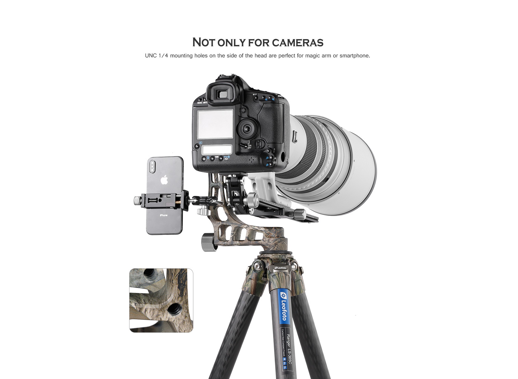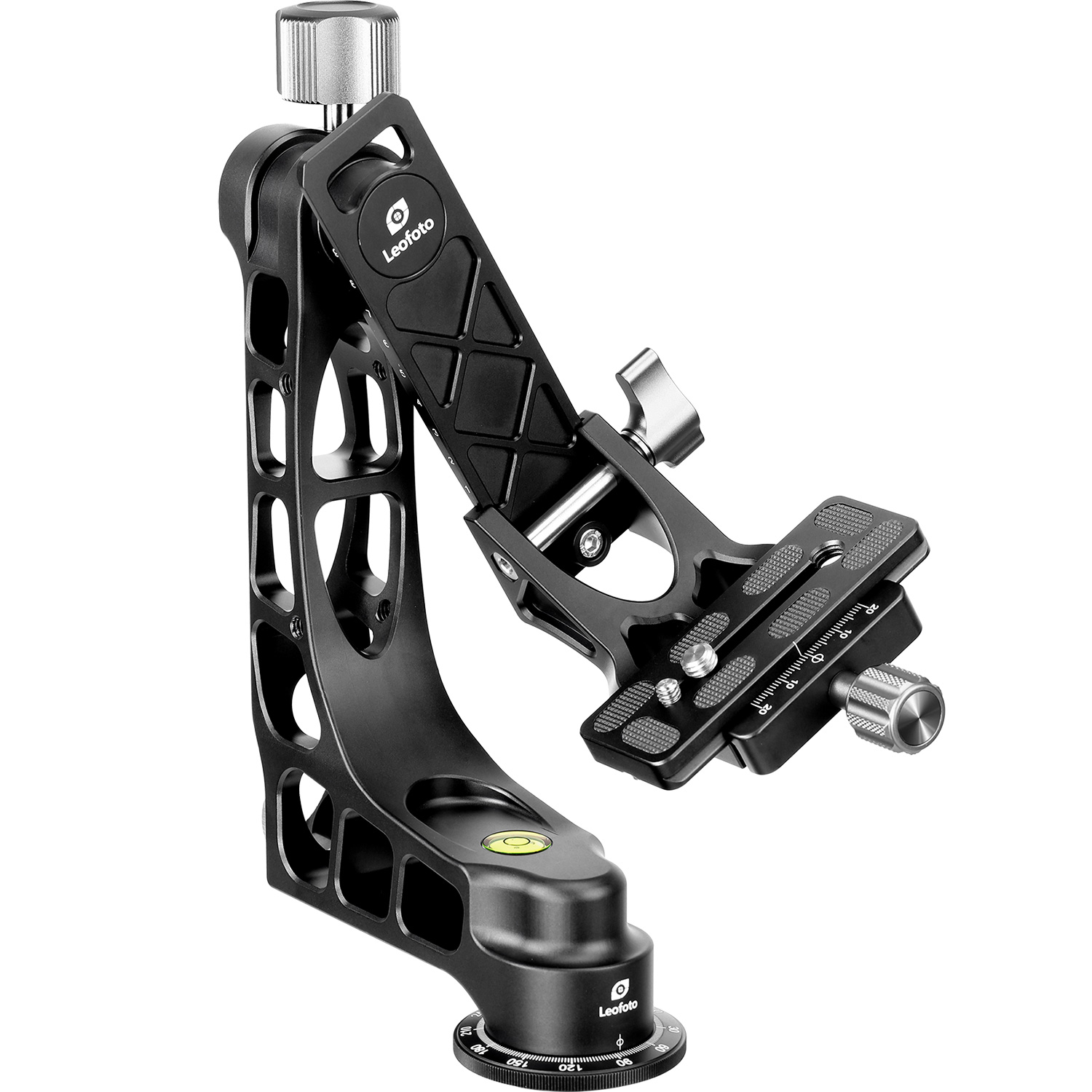 Travel lightly with the Leofoto PG-1 Gimbal Head constructed from T6061 aluminum. The PG-1 enables you to capture fast-moving subjects with a large and heavy telephoto lens that you otherwise could not do manually holding the lens. The arm swings back and forth and can be locked down at the required angle. The camera platform, which is Arca-type compatible, has height adjustability to help balance a telephoto lens on the head. Future setups can be easily repeated because of the printed scale on the side of the swing arm. Also, on the side of the arm are 1/4″-20 sockets for accessories. The gimbal head can easily hold up to 55 lb of equipment and rotate a full 360° while keeping the horizon straight using the bubble level at the base of the head.