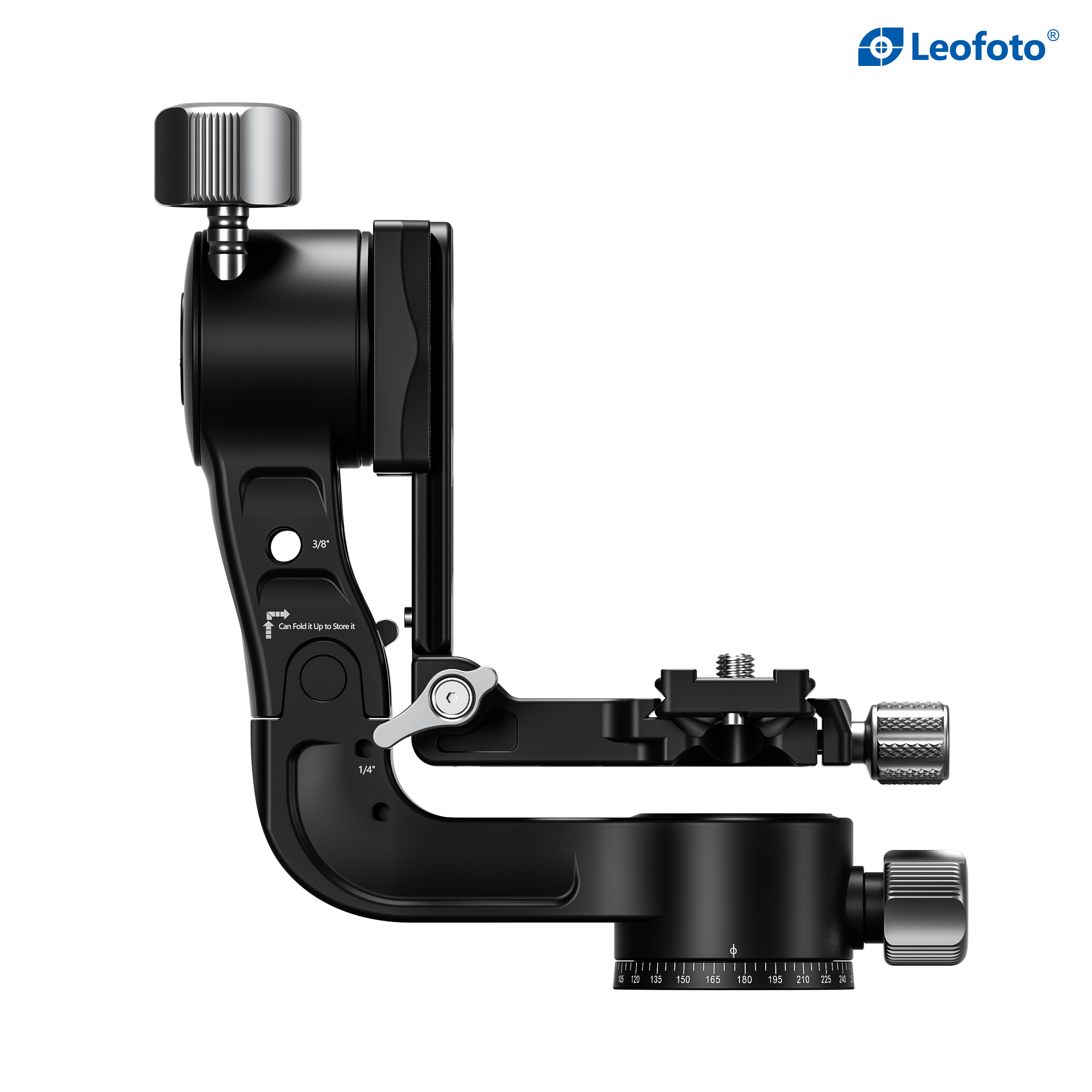 The Leofoto PG-2/PG-2L Folding Gimbal Head is constructed from T-6061 aluminum and hard anodized for maximum strength and durability. The PG-2 enables you to capture fast-moving subjects with a large and heavy telephoto lens that you otherwise could not do manually holding the lens. The arm swings back and forth and can be locked down at the required angle and the gimbal also has a bubble level on the base. The camera platform, which is Arca-type compatible, has height adjustability to help balance a telephoto lens on the head.  Along the arm of the gimbal are a 3/8″ and two 1/4″ accessory sockets. The design of the PG-2/PG-2L allows for the gimbal to collapse for a more portable footprint, perfect for traveling when space is limited. The body has also been hollowed-out to optimize the weight to strength ratio.