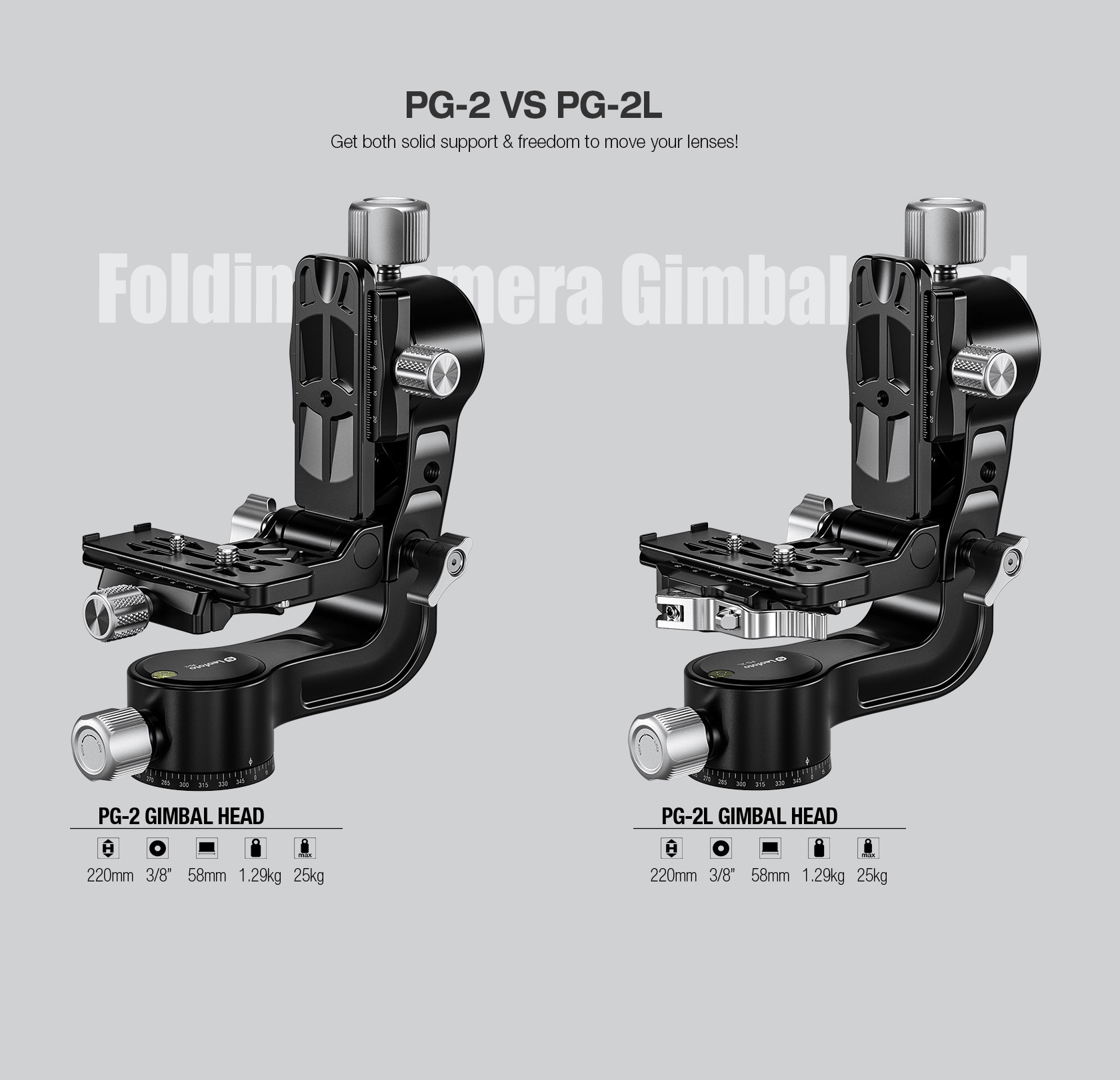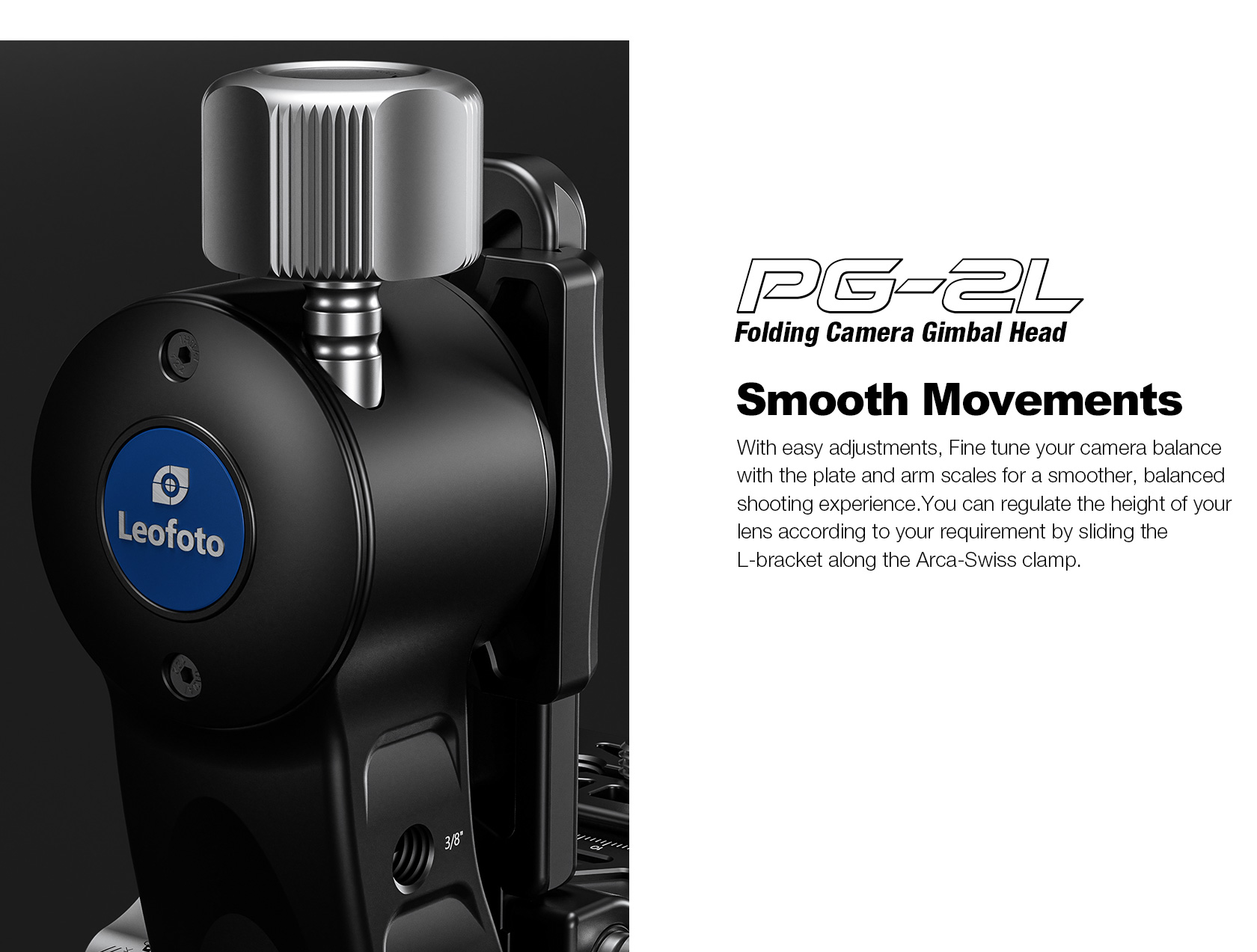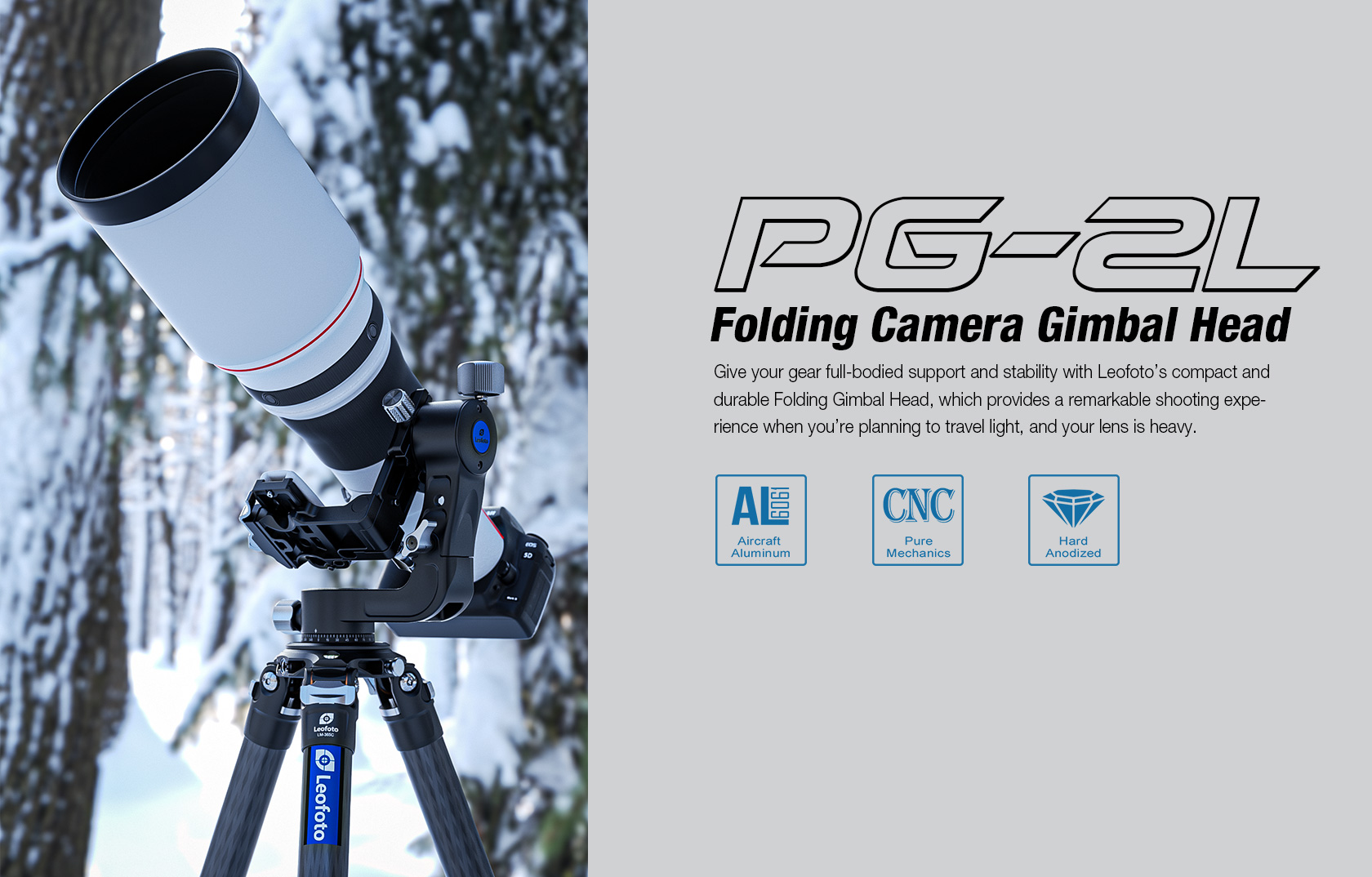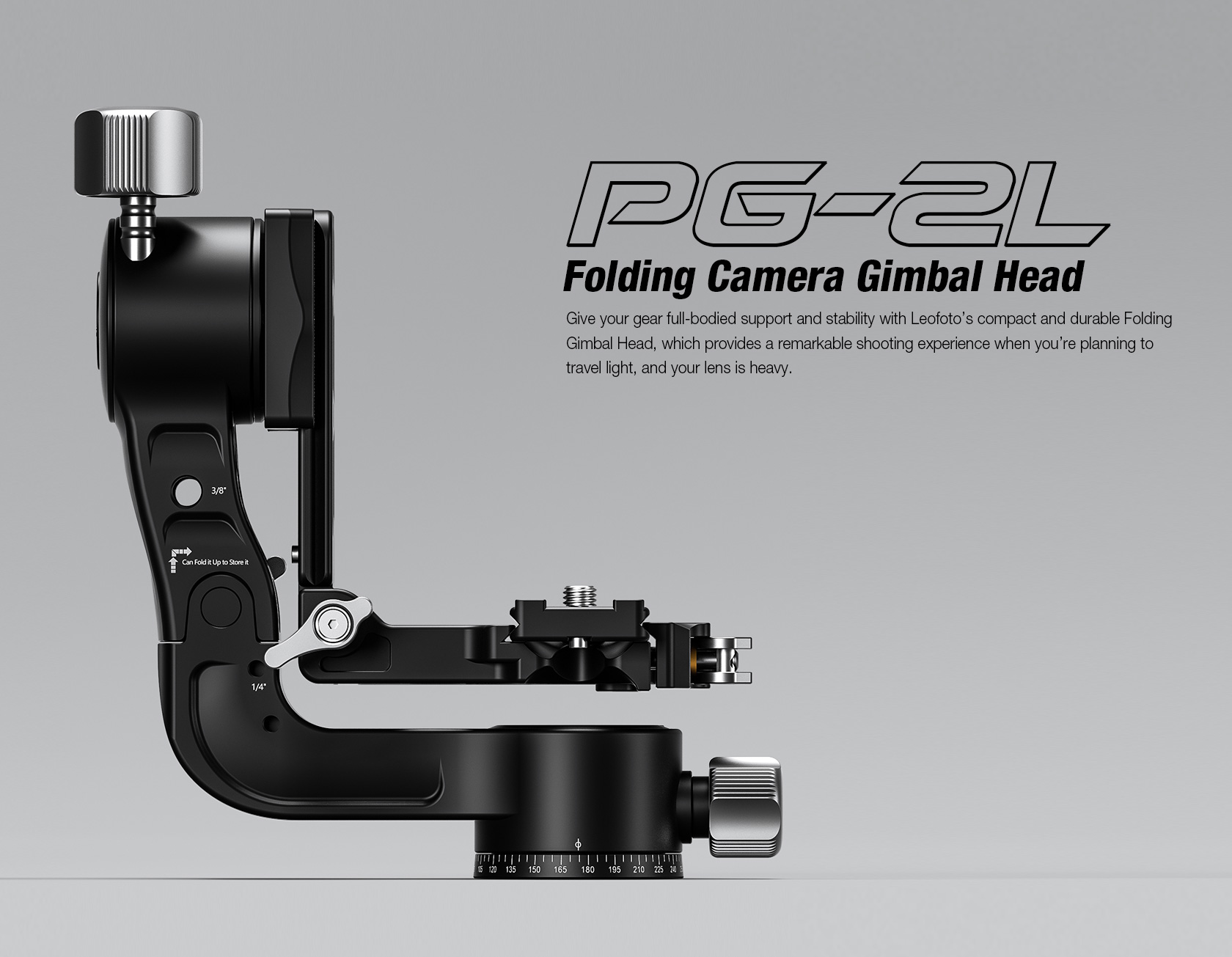 The Leofoto PG-2/PG-2L Folding Gimbal Head is constructed from T-6061 aluminum and hard anodized for maximum strength and durability. The PG-2 enables you to capture fast-moving subjects with a large and heavy telephoto lens that you otherwise could not do manually holding the lens. The arm swings back and forth and can be locked down at the required angle and the gimbal also has a bubble level on the base. The camera platform, which is Arca-type compatible, has height adjustability to help balance a telephoto lens on the head.  Along the arm of the gimbal are a 3/8″ and two 1/4″ accessory sockets. The design of the PG-2/PG-2L allows for the gimbal to collapse for a more portable footprint, perfect for traveling when space is limited. The body has also been hollowed-out to optimize the weight to strength ratio.