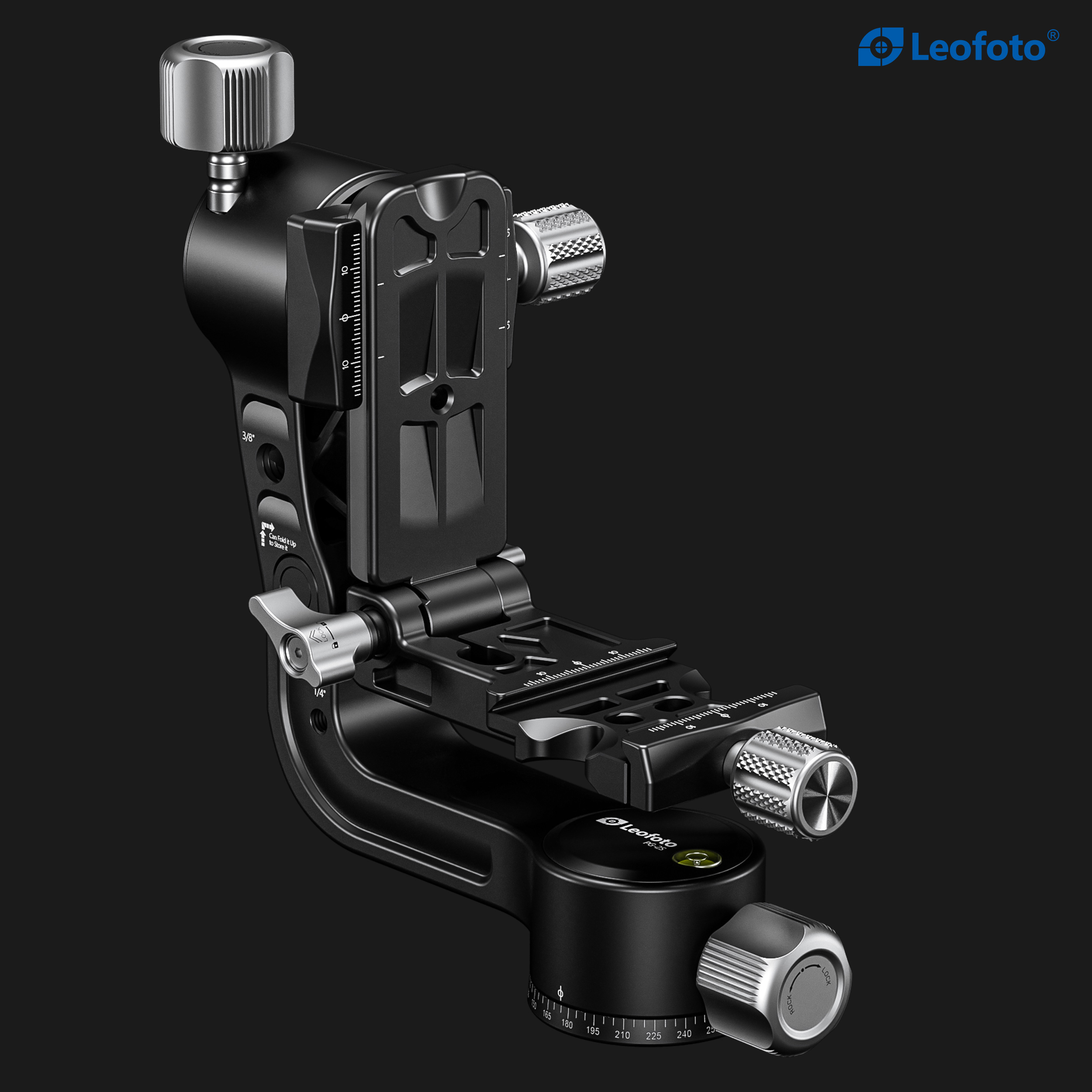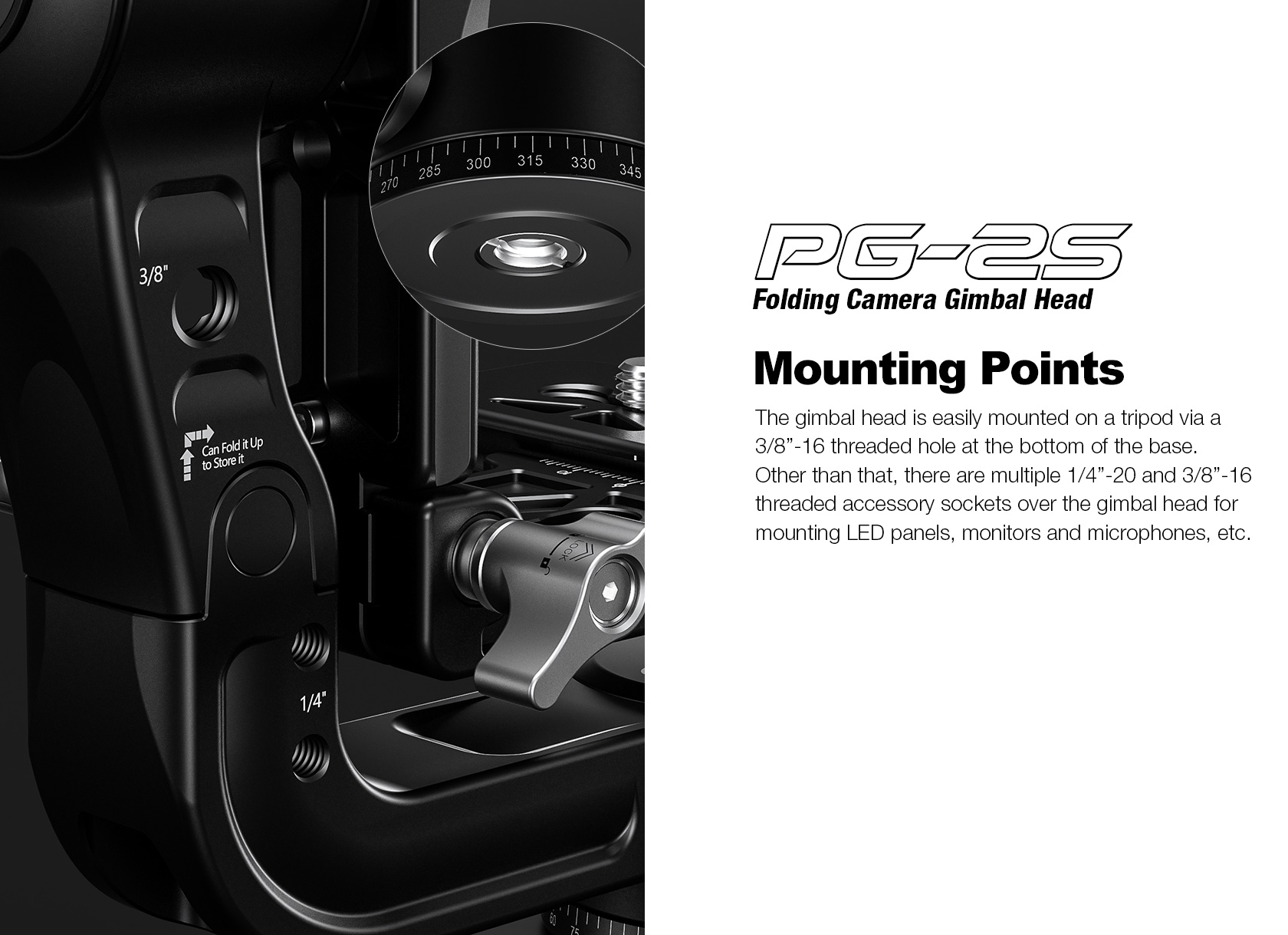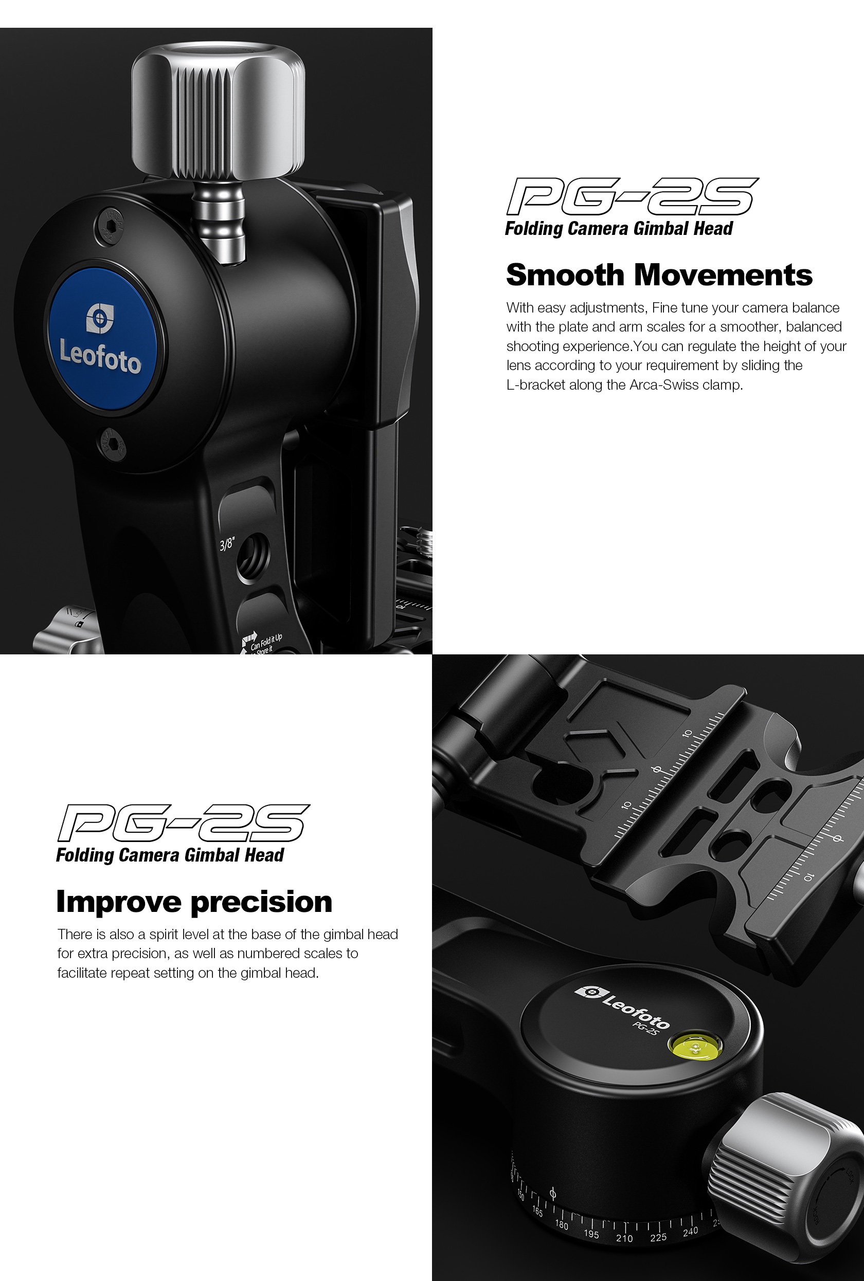The Leofoto PG-2S Compact Mini Folding Gimbal Head is a smaller and more compact iteration of the PG-2 head, designed for enhanced portability and compact usage. It is constructed from T-6061 aluminum and hard anodized for maximum strength and durability. The PG-2S enables you to capture fast-moving subjects with a large and heavy telephoto lens that you otherwise could not do manually holding the lens. The arm swings back and forth and can be locked down at the required angle and the gimbal also has a bubble level on the base. The camera platform, which is Arca-type compatible, has height adjustability to help balance a telephoto lens on the head. Along the arm of the gimbal are a 3/8″ and two 1/4″ accessory sockets. The design of the PG-2S allows for the gimbal to collapse for a more portable footprint, perfect for traveling when space is limited. The body has also been hollowed-out to optimize the weight to strength ratio. There is a certain stiffness designed with this model to enhance control and stability during use.