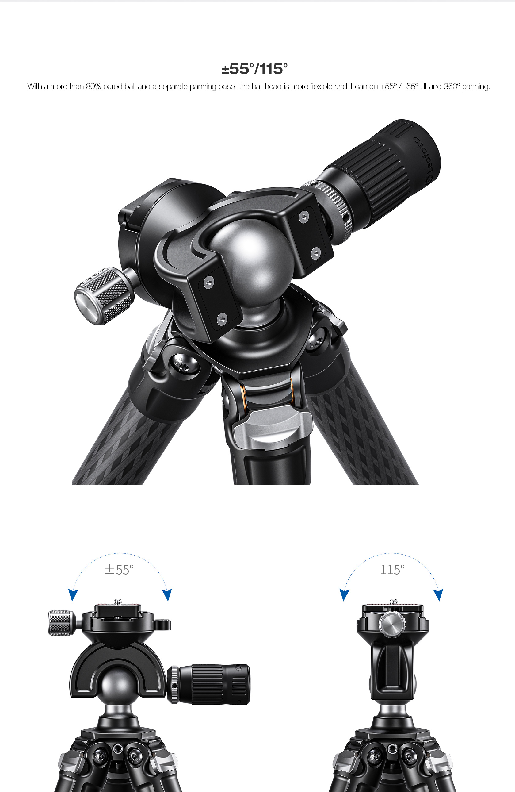 * Tripods must occasionally withstand tremendous bending and torsion loads. It is crucial that the leg angle stops and all other structural joints are well supported. Leofoto offset leg joints fully support the leg angle stops allowing loads to be transferred straight through the strongest members of the tripod. This also means the tripod is more compact when collapsed