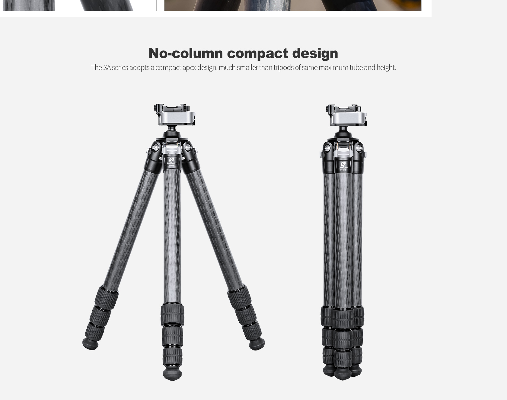 * Tripods must occasionally withstand tremendous bending and torsion loads. It is crucial that the leg angle stops and all other structural joints are well supported. Leofoto offset leg joints fully support the leg angle stops allowing loads to be transferred straight through the strongest members of the tripod. This also means the tripod is more compact when collapsed
