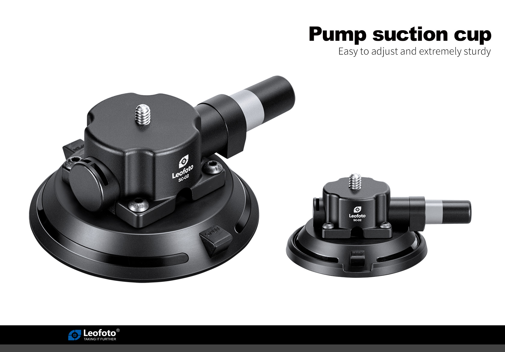 Mount a smartphone on a vehicle for motion shots with the Leofoto SC-02 Suction Cup Mounting Kit. The kit consists of a strong SC-02 suction cup, an articulating versa magic-arm, and a PC-90II smartphone clamp. The suction cup mounts onto a flat, clean, non-porous surface and supports up to a maximum 88lb load.