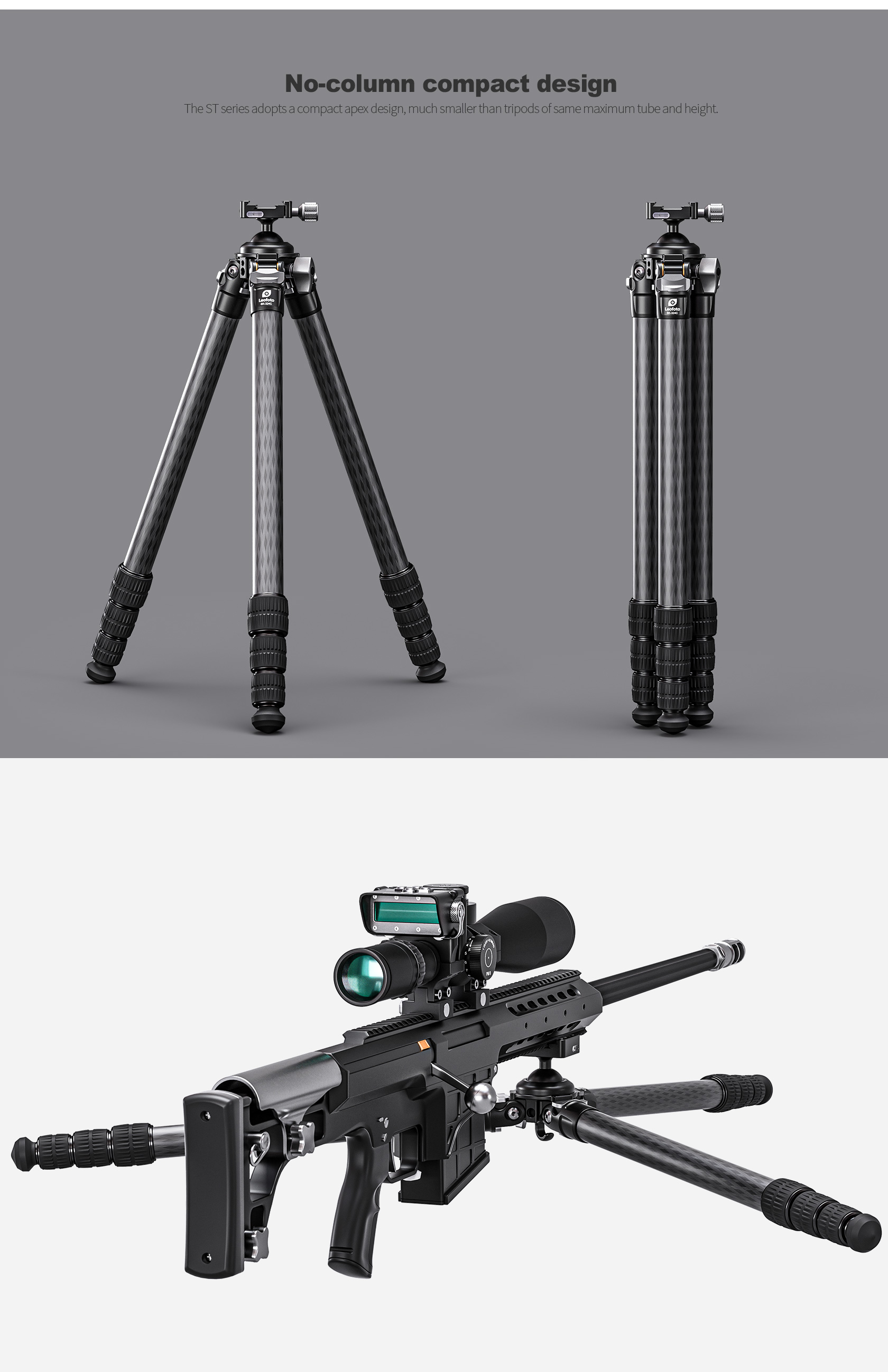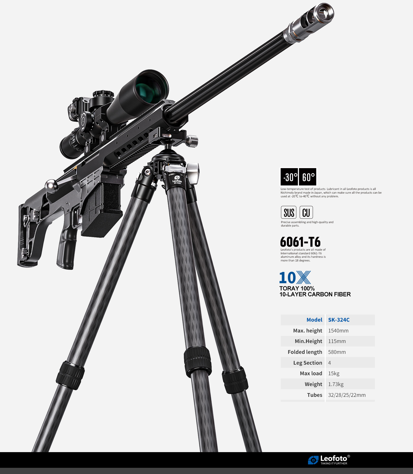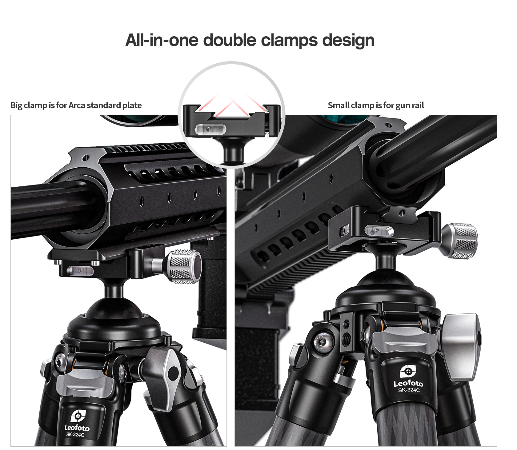 The Leofoto SK Series Rifle Tripods are one of the most compact apex setups on the market with a perfectly balanced weight to strength ratio. The SK Series features a knob-controlled clamp, with the option to choose either a dual Arca & Picatinny clamp or an Arca-only clamp, along with a knob-controlled, integrated ball head. These tripods provide maximum rigidity, making them ideal for supporting non-traditional shooting positions. They also feature three angle stop positions to increase shooting position capabilities and a compact design which maintains a small footprint, creating a tripod setup which is extremely easy to pack and carry on the go. The brand new “X” version features a new knurled-bar angle stop design, which allows for one handed operation.