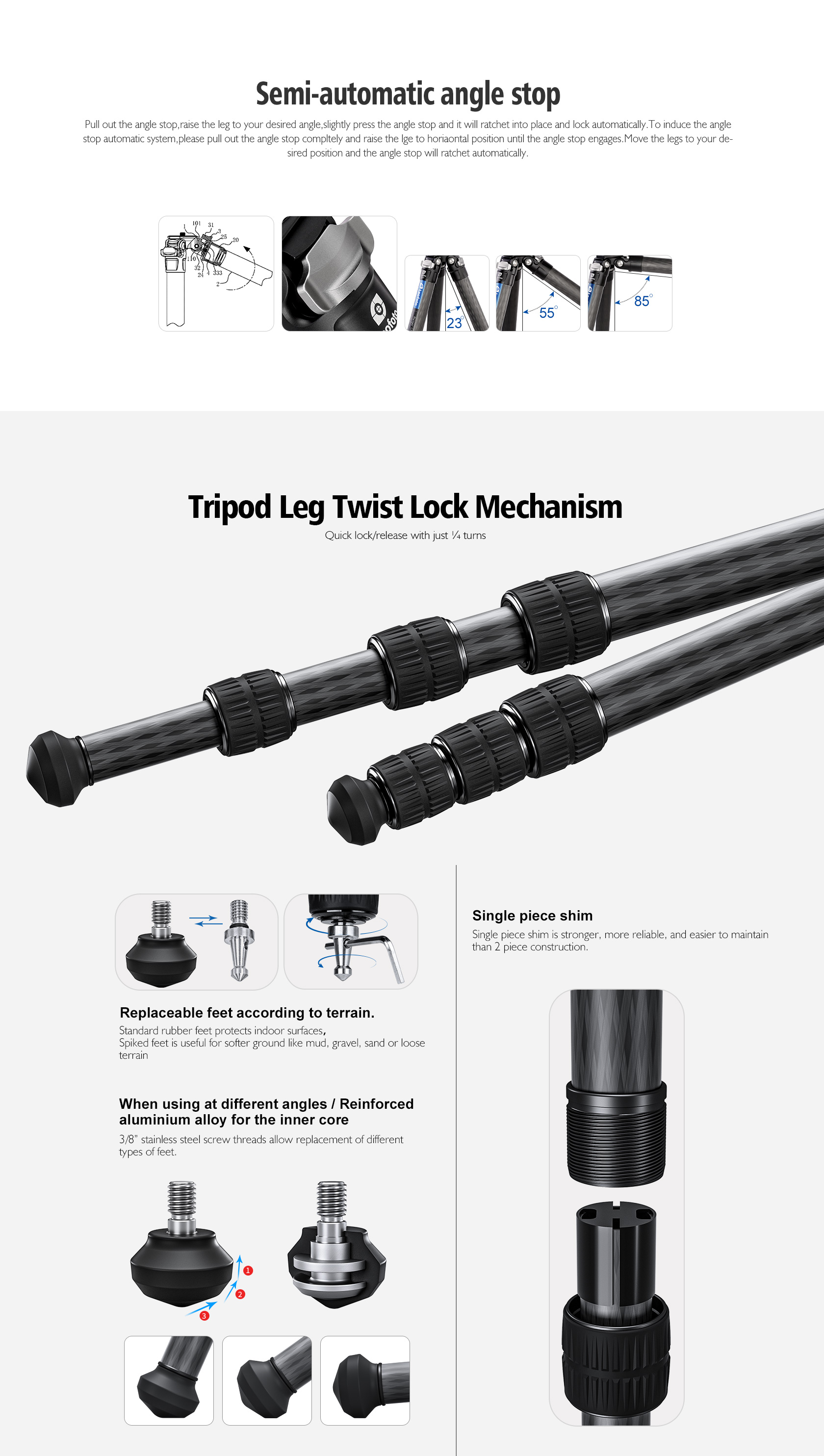 * Tripods must occasionally withstand tremendous bending and torsion loads. It is crucial that the leg angle stops and all other structural joints are well supported. Leofoto offset leg joints fully support the leg angle stops allowing loads to be transferred straight through the strongest members of the tripod. This also means the tripod is more compact when collapsed