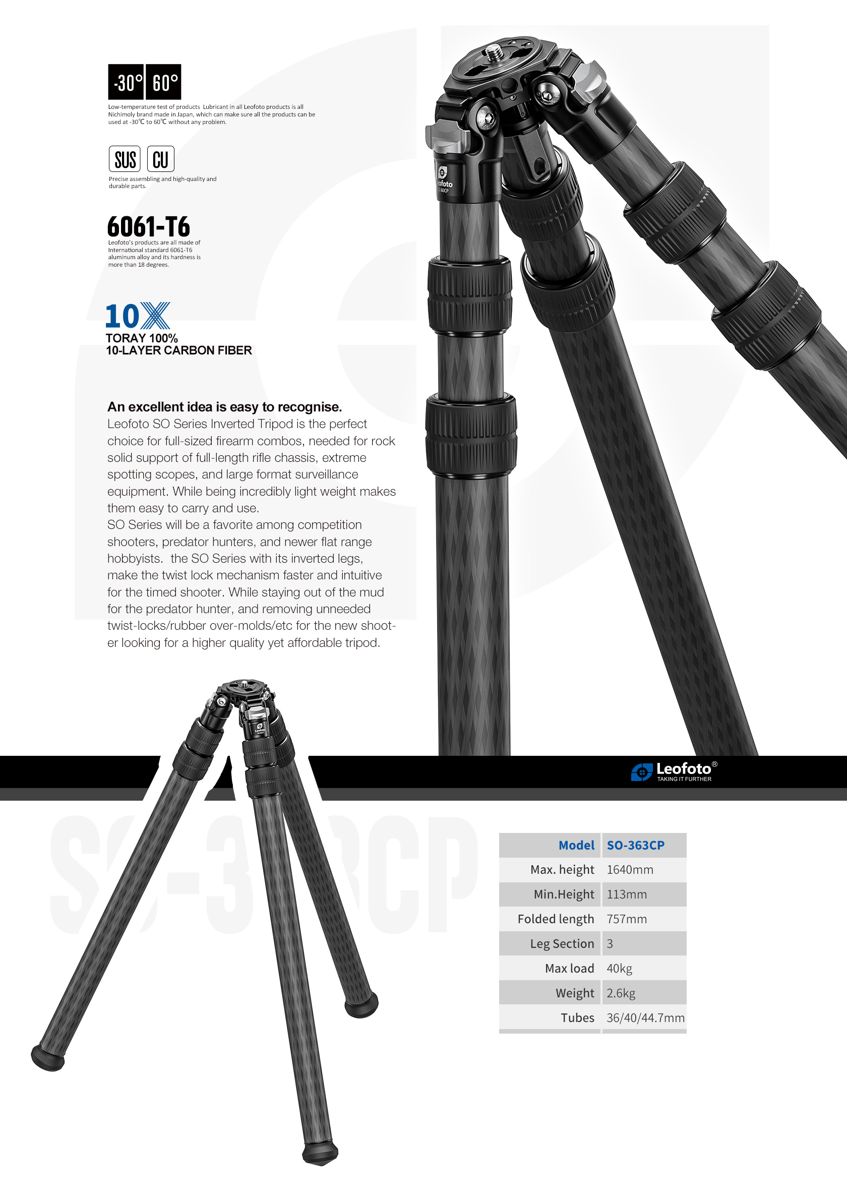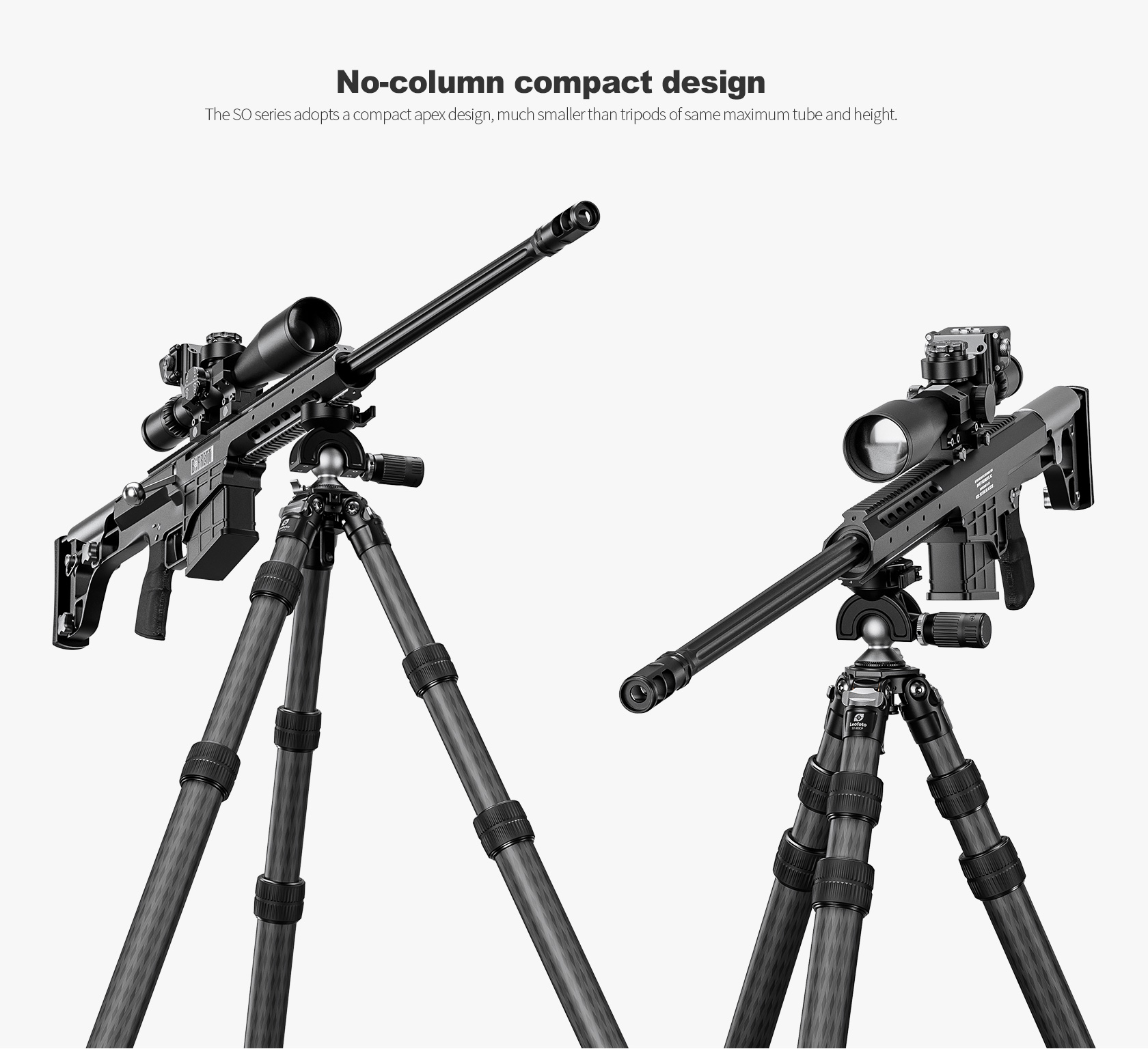The Leofoto SO-363CP 3-Section Inverted Carbon Fiber Tripod (FIXED Apex/Platform) is an excellent choice for full-sized firearm combos that need rock-solid support for a full-length rifle chassis with a spotting scope. Available in two sizes for your convenience: a small, portable option and a full-size version for all your needs. The robust load capacity also makes it suitable for use with extreme spotting scopes, cameras, and large format surveillance equipment. The new “X” version features a knurled-bar angle stop design which allows for one handed operation as well as leg tubes which do not cross.