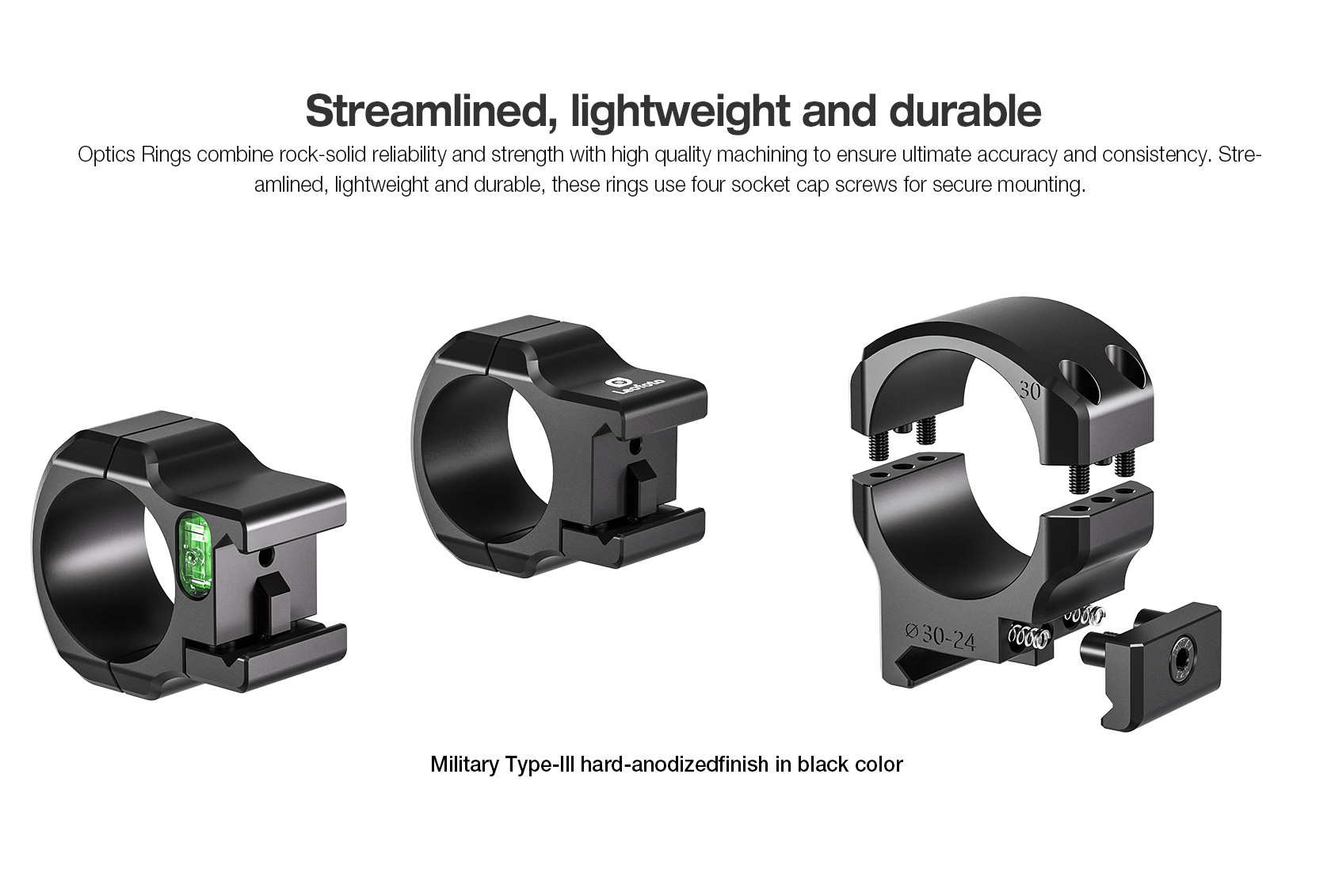Use this Optics rings for mounting 30 mm telescopic sights onto flattop style rifles. The 2 or 3-inch offset of this Optics rings positions the scope in a forward location, allowing the correct eye relief and head placement on an rifles. Lightweight, aluminium clamps and housing reduce total weight without sacrificing reliability. The Optics rings mount positions the center of the riflescope tube at a height of 0.94 inches (24mm) from the base.Cantilever Rings combine rock-solid reliability and strength with high quality machining to ensure ultimate accuracy and consistency. Streamlined, lightweight and durable, these rings use four socket cap screws for secure mounting.
