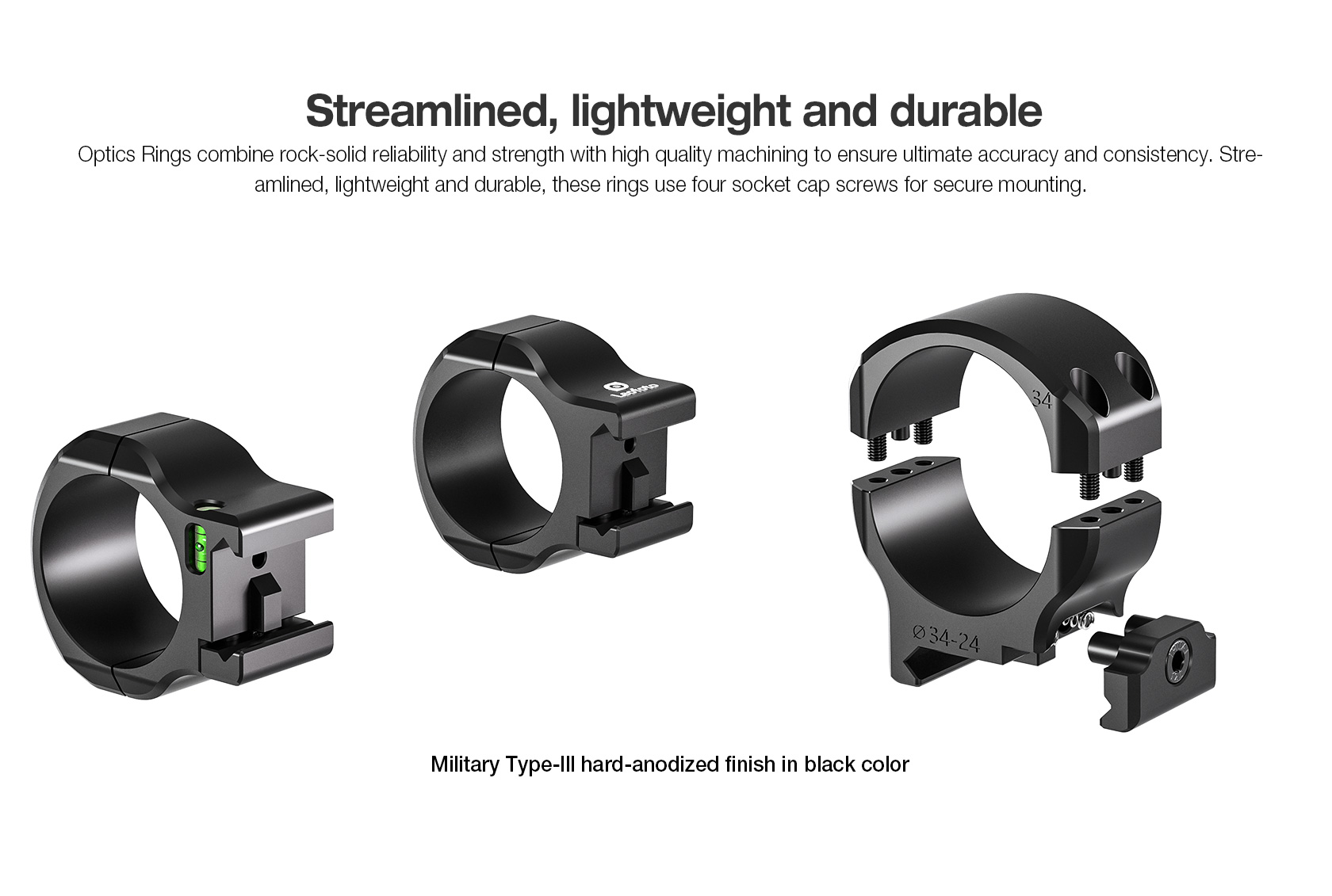 Use this Optics rings for mounting 34 mm telescopic sights onto flattop style rifles. The 2 or 3-inch offset of this Optics rings positions the scope in a forward location, allowing the correct eye relief and head placement on an rifles. Lightweight, aluminium clamps and housing reduce total weight without sacrificing reliability. The Optics rings mount positions the center of the riflescope tube at a height of 0.94 inches (24mm) from the base.Cantilever Rings combine rock-solid reliability and strength with high quality machining to ensure ultimate accuracy and consistency. Streamlined, lightweight and durable, these rings use four socket cap screws for secure mounting.