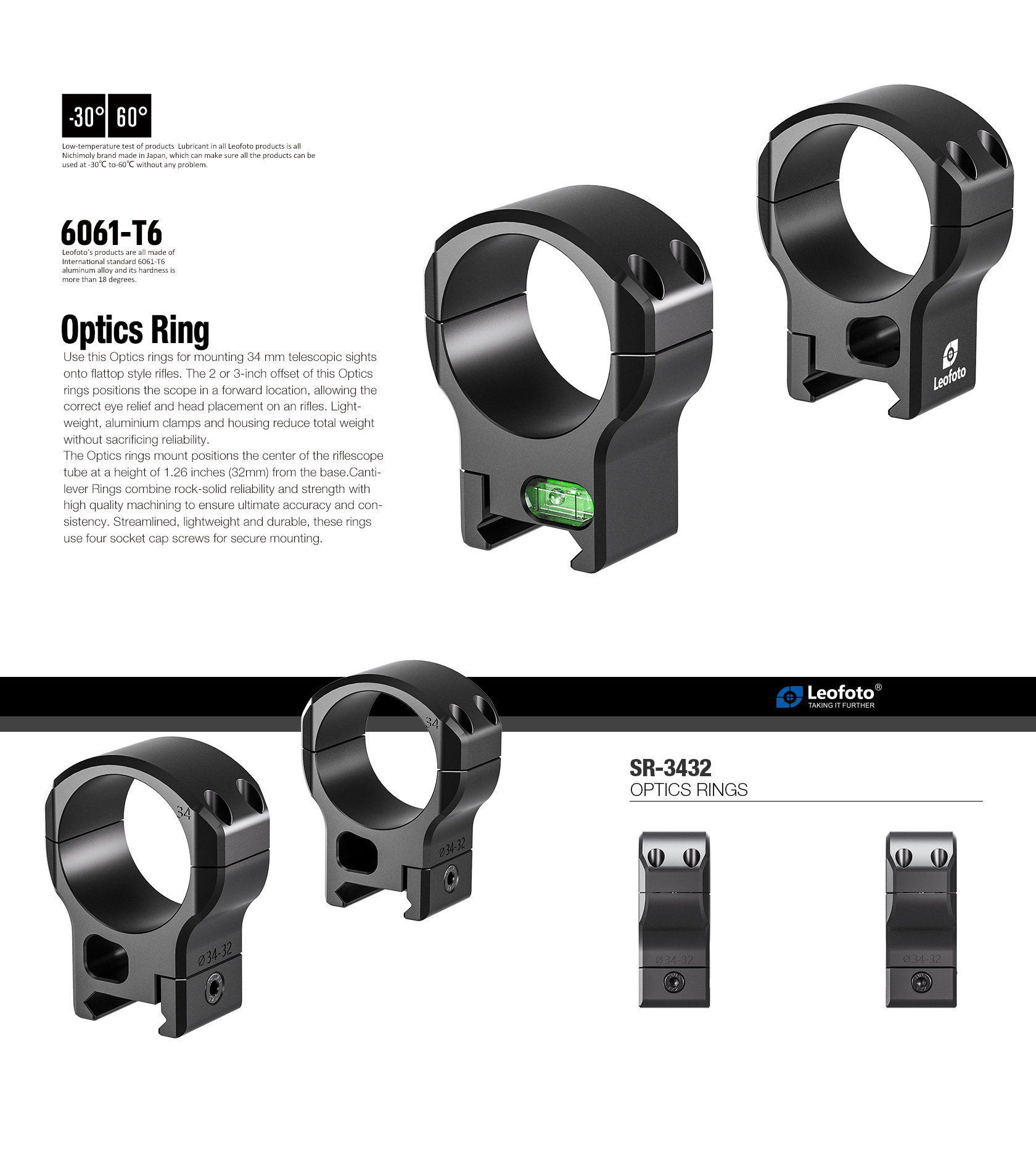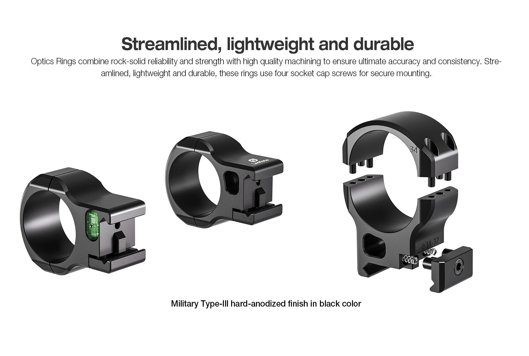 Use this Optics rings for mounting 34 mm telescopic sights onto flattop style rifles. The 2 or 3-inch offset of this Optics rings positions the scope in a forward location, allowing the correct eye relief and head placement on an rifles. Lightweight, aluminium clamps and housing reduce total weight without sacrificing reliability. The Optics rings mount positions the center of the riflescope tube at a height of 1.26 inches (32mm) from the base.Cantilever Rings combine rock-solid reliability and strength with high quality machining to ensure ultimate accuracy and consistency. Streamlined, lightweight and durable, these rings use four socket cap screws for secure mounting.