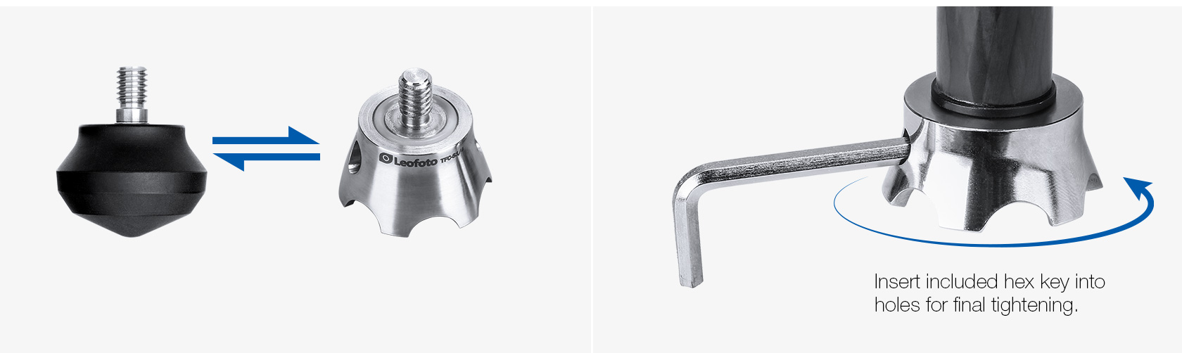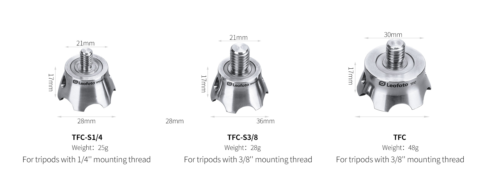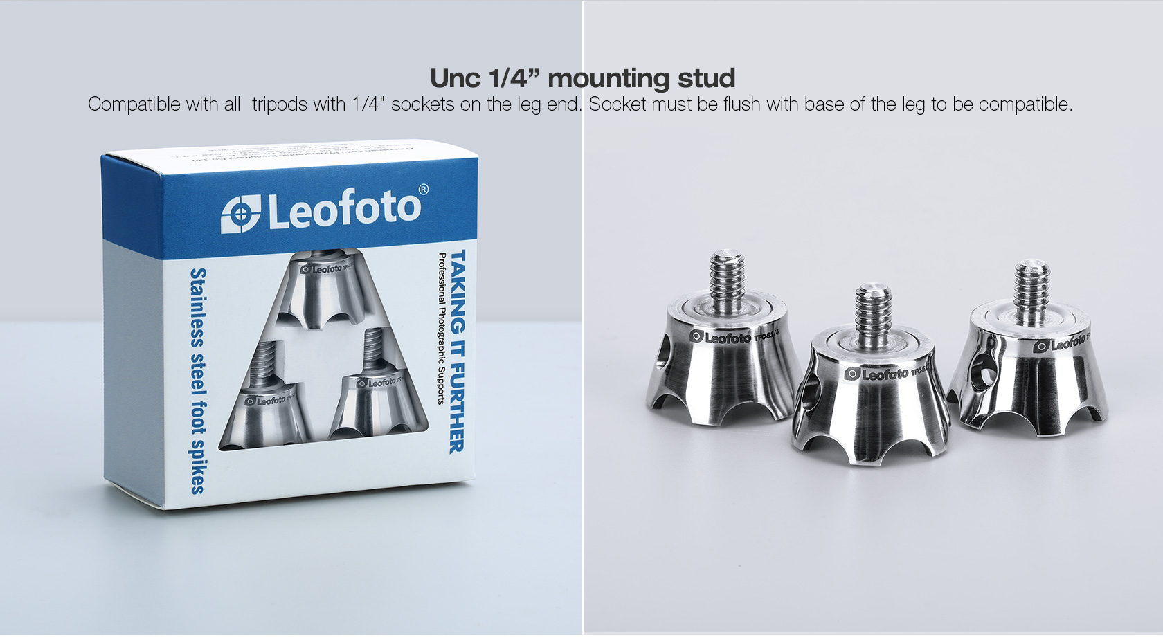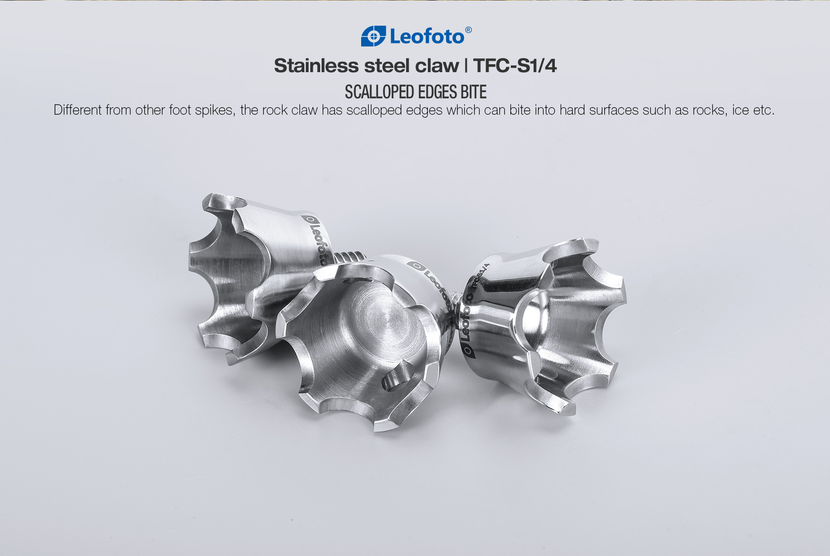 The Leofoto TFC Series Claw Feet are precision machined stainless steel feet with scalloped, sharp-edged claws. These feet are ideal to use on uneven, rocky terrain, they dig into the ground and keep a good grip. Each claw features a 1/4″ mounting screw and can be attached to the bottom of tripod legs that have a 1/4″ thread for tripod feet.