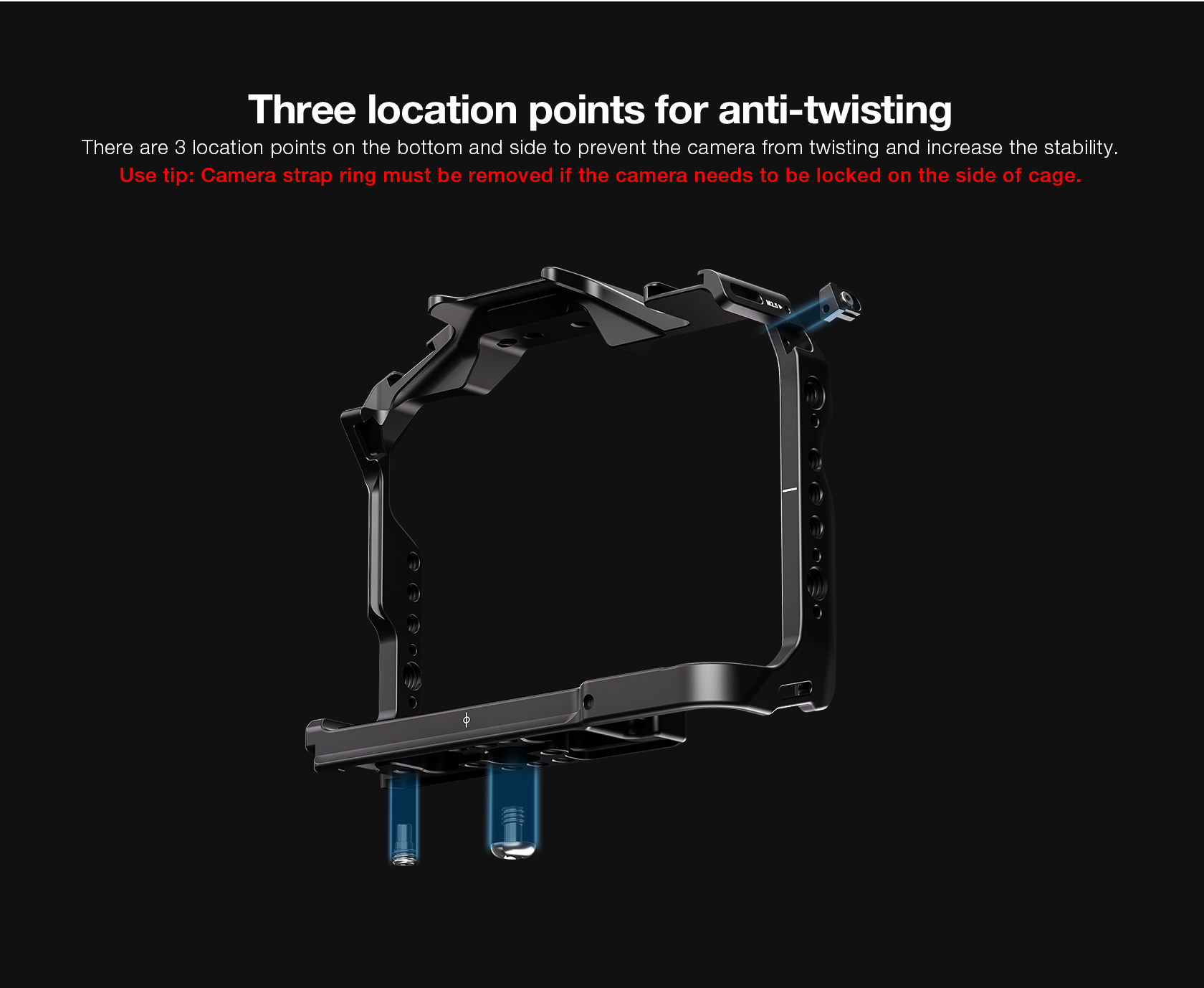 The cage incorporates multiple 1/4″-20 and 3/8″-16 ARRI-style accessory threads for additional mounting options.