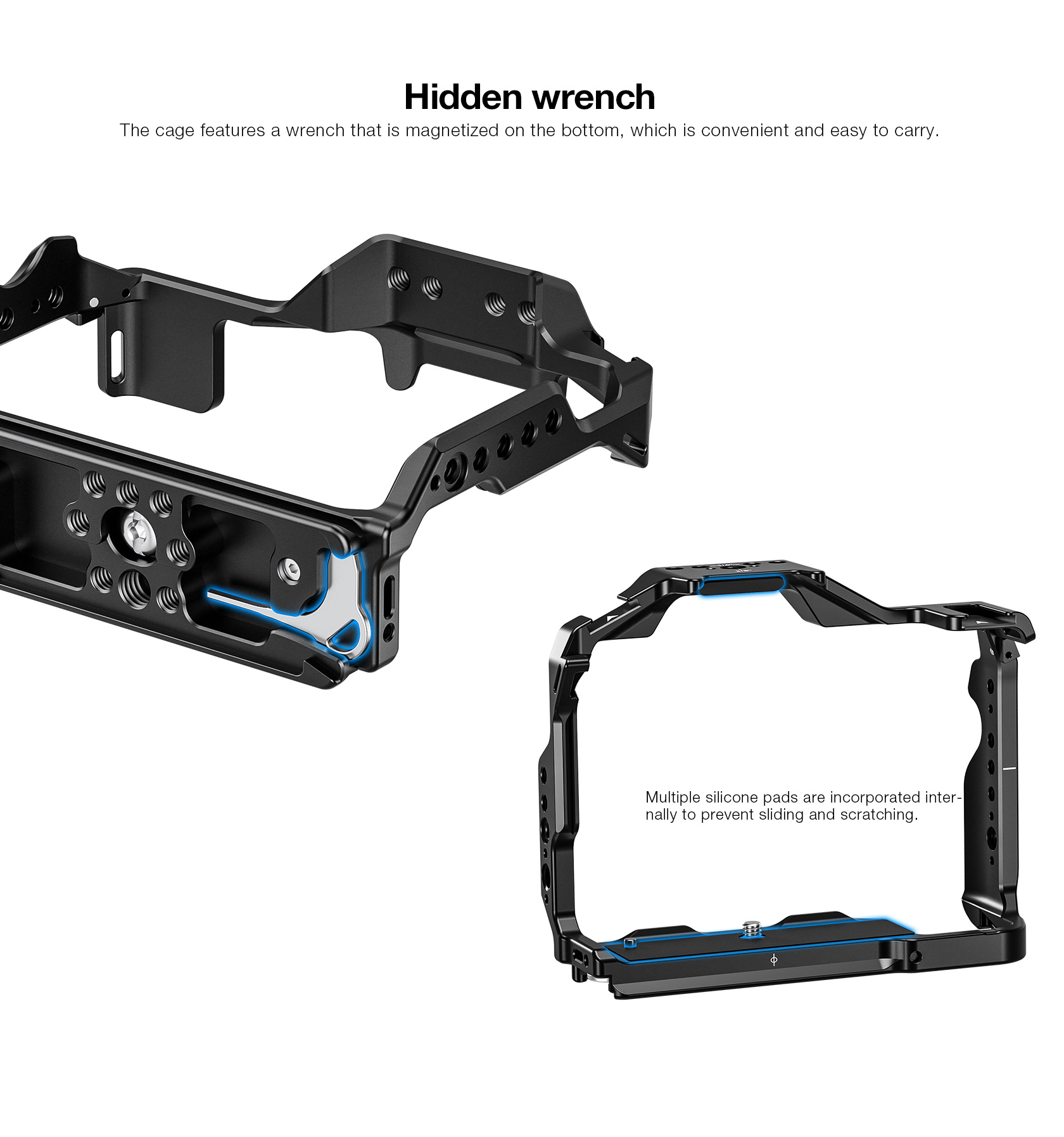 Protect and add accessories to your Nikon Z8 camera with this Leofoto Z8 Camera Cage. The form-fitting aluminum cage protects your camera without impeding access to your camera’s functions, displays, ports, or battery. The camera mounts on the cage via a 1/4″-20 stud screw, and the mounting surface features anti-slip pads that help hold your camera securely in the cage.