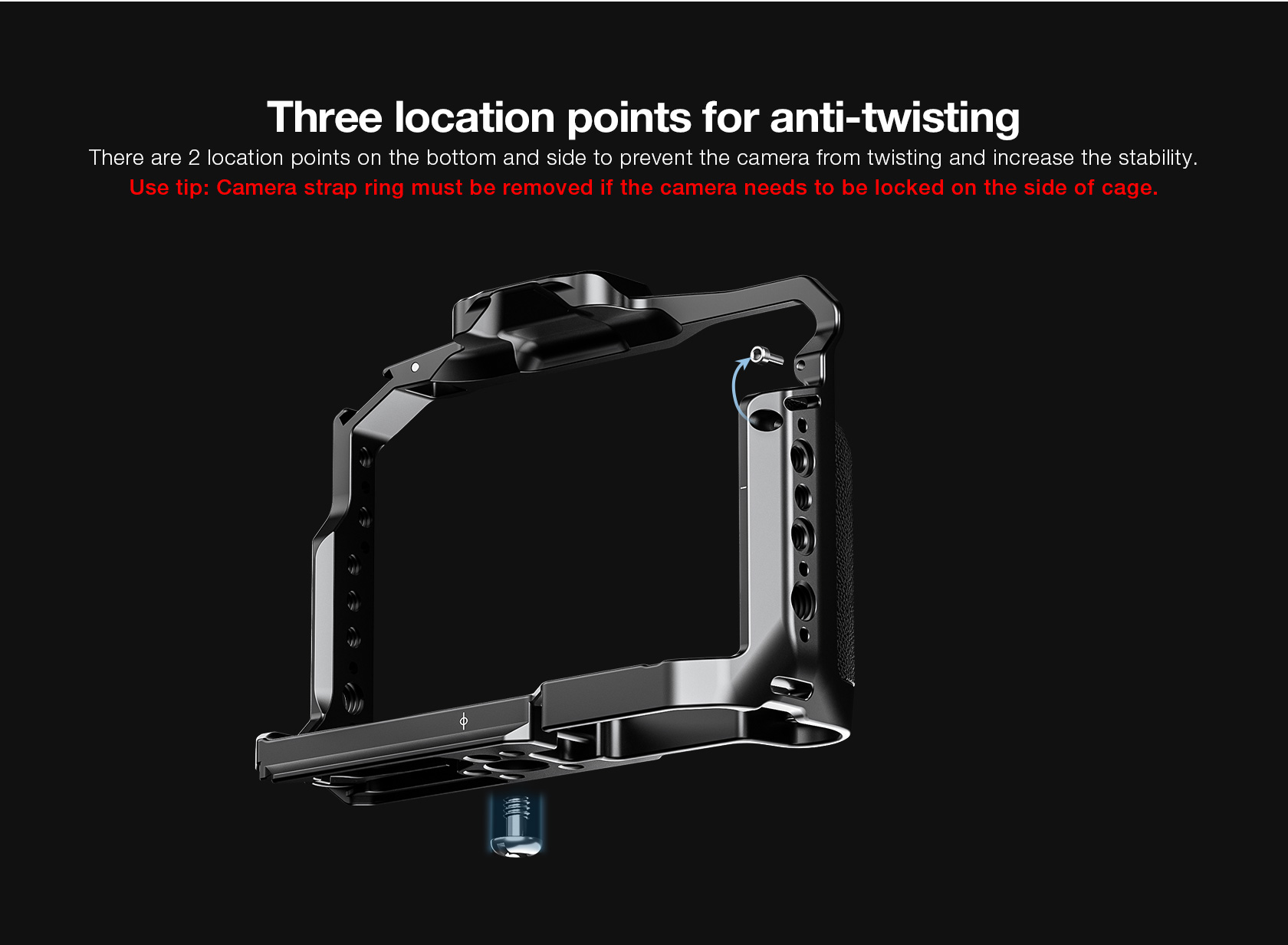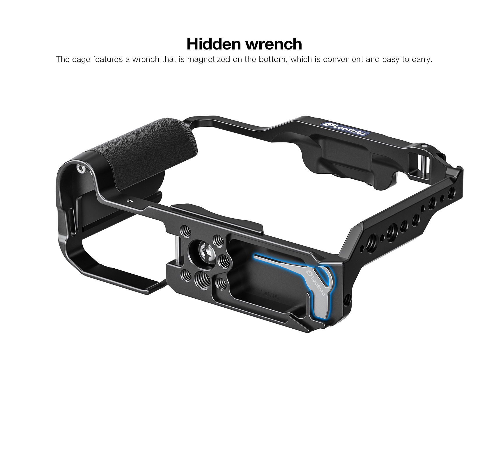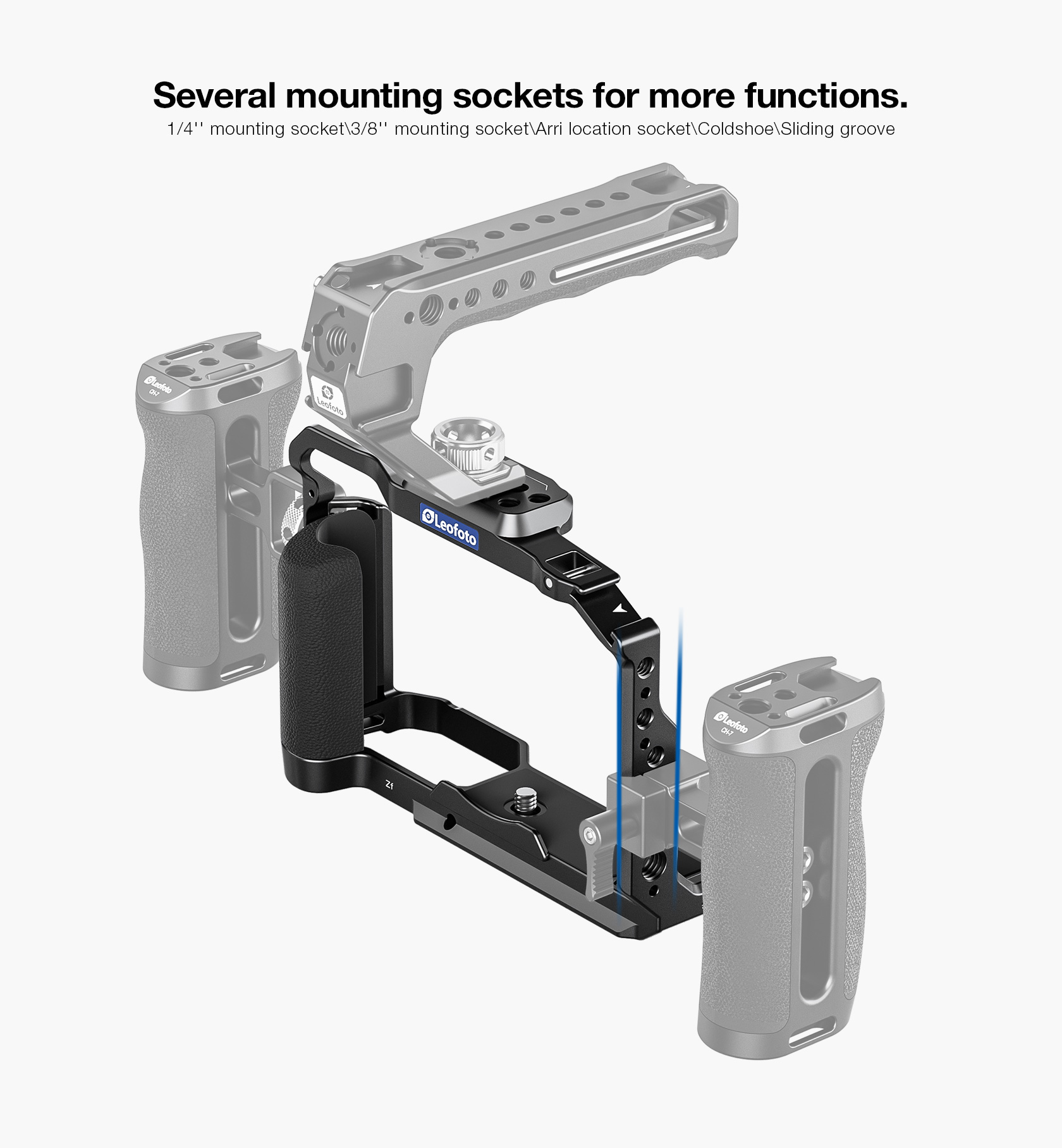 The cage incorporates multiple 1/4″-20 and 3/8″-16 ARRI-style accessory threads for additional mounting options. The bottom of the cage is tapped with 1/4″-20 and 3/8″-16 threads to connect a camera plate for tripod mounting.