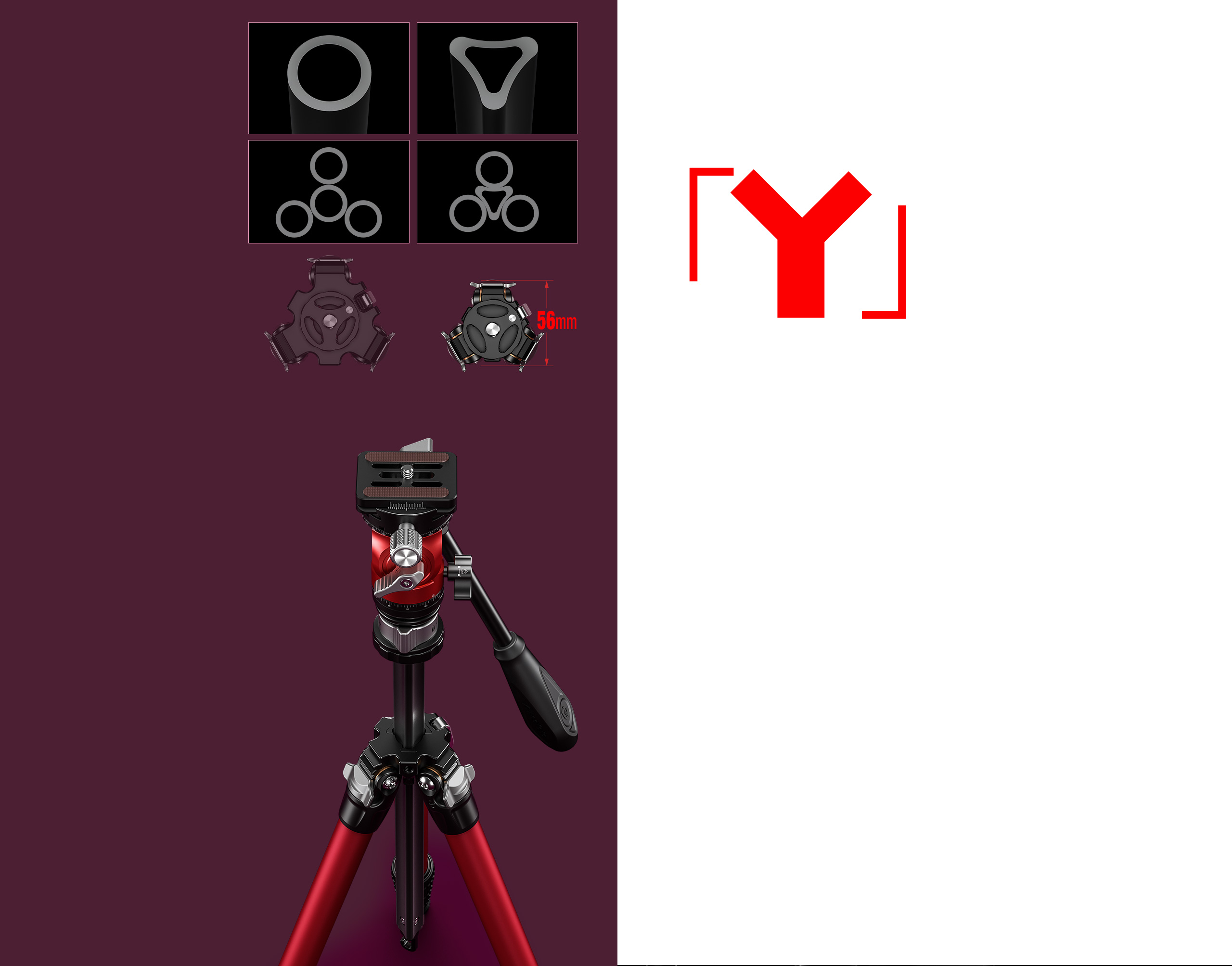 Different from the traditional O shaped center column, the Y shaped center column allows the tripod legs to be closer together when folded, reducing the packed diameter of the tripod without sacrificing its stability and functions. Featured 56” max height and 19” folded length, Mr. Y can be packed in the suitcase easily.