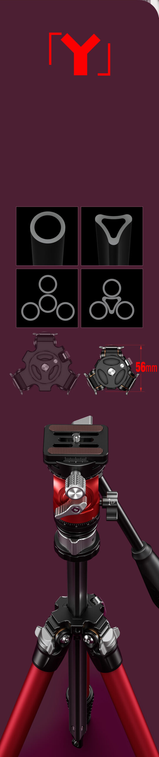 Tripod with Y-shaped center column is more compact and 3 legs are more tight and more stable than tripod with round center column when the diameter of leg is same.