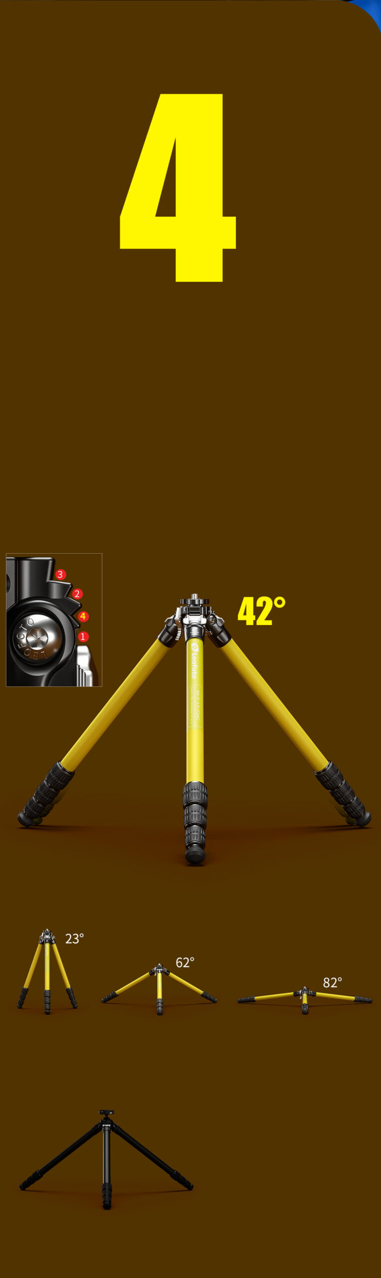 Most of the tripods in the market are with only angles including low, middle and high angles. To help photographers who go windy outdoors for shooting, we add a 42° setting to the tripod to make sure that even in windy outdoors, the shooting can still be stable.